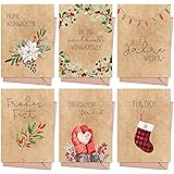 Weihnachtliche Grüße ganz einfach! Dieses Set mit 12 wunderschönen Weihnachtskarten im A6 Format (10,5x14,8cm) macht das Verschicken von Weihnachtsgrüßen zum Kinderspiel. Jede Karte ist eine Klappkarte aus hochwertigem, dickem Papier (350-400g/qm) und kommt mit passendem Umschlag. Ob mit weihnachtlichen Sprüchen oder Platz für deine persönlichen Worte - hier ist für jeden Geschmack etwas dabei. Perfekt für Weihnachtsgrüße an Familie und Freunde, als Einladungskarten für die Weihnachtsfeier oder als besondere Karte für Geldgeschenke. Einfach deine persönliche Nachricht reinschreiben, Adresse drauf und ab in den Briefkasten! Das komplette Set kommt von einem deutschen Händler - Qualität, auf die du dich verlassen kannst. Mach deinen Liebsten eine Freude mit persönlichen Weihnachtsgrüßen!