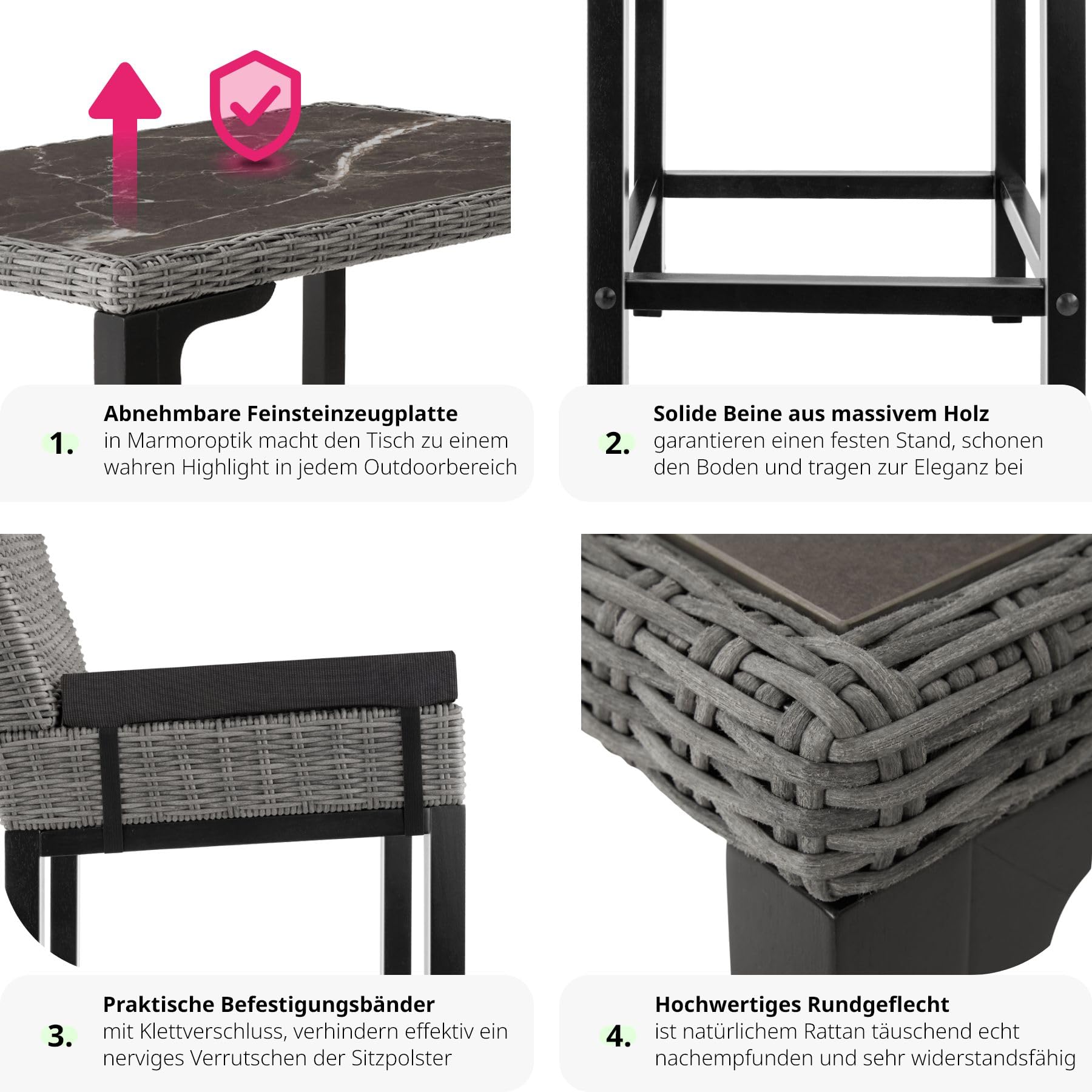 Suchst du was für deine Terrasse? Dieses 3-teilige Bar-Set ist genau das Richtige! Mit nem 140cm langen Tisch und zwei super-bequemen Barhockern. Die sind gepolstert und haben ne ergonomische Rückenlehne - da sitzt es sich stundenlang gemütlich. Aus robustem Metall, also hält was aus. Die verstellbaren Füße sorgen für Standfestigkeit, auch auf unebenem Boden. Perfekt für Balkon, Garten oder Terrasse. Sieht schick aus und ist mega-praktisch. Montage ist easy - schnell zusammengebaut und schon kannst du dich mit nem Kaffee oder Drink draufsetzen. Einfach abwischen und fertig. Genial für gemütliche Stunden im Freien!