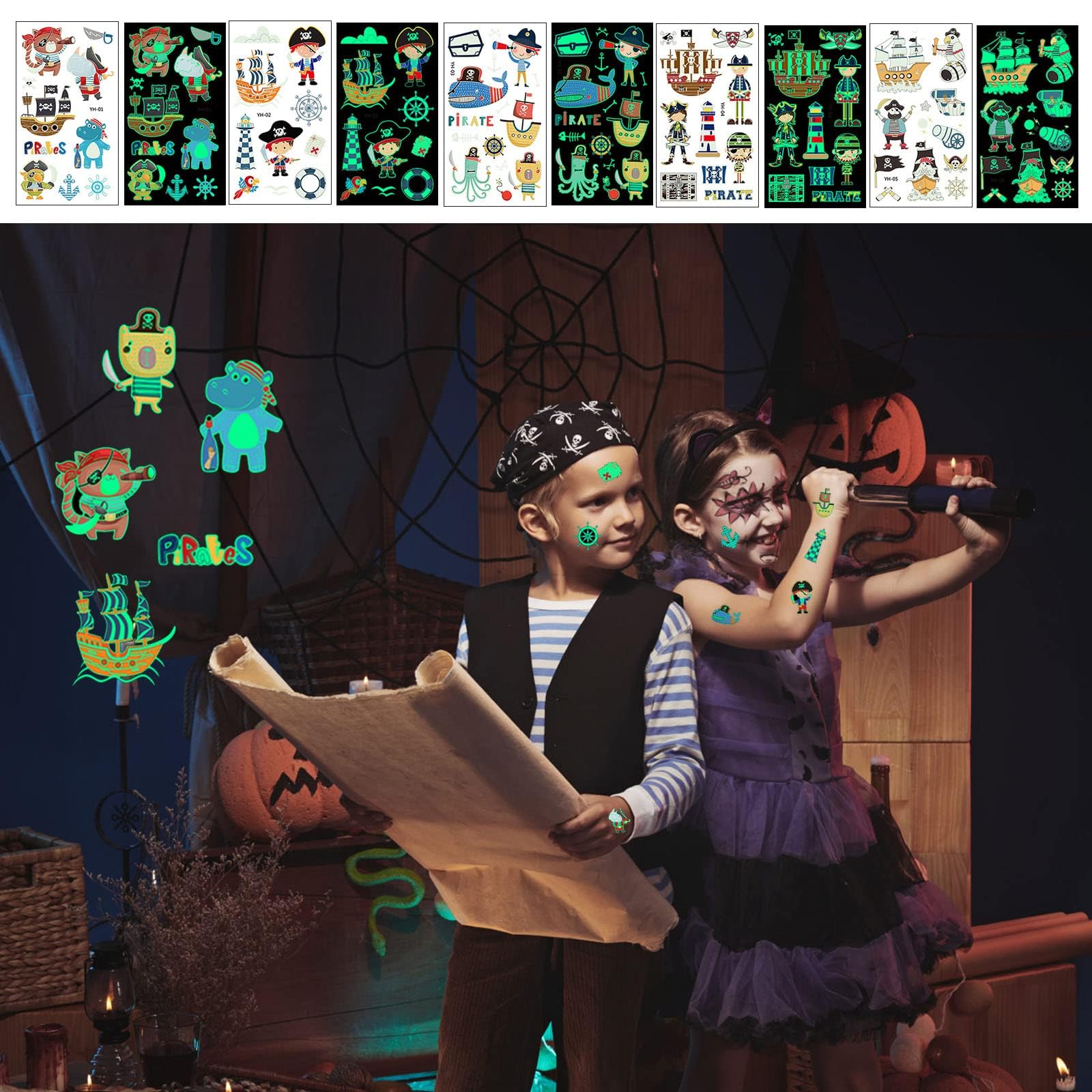 Alles aus hochwertigem, hautfreundlichem Material. Die bunten Designs mit Schiffen und Schatzkarten regen die Fantasie an. Perfekt für Mottopartys, Karneval oder Halloween.