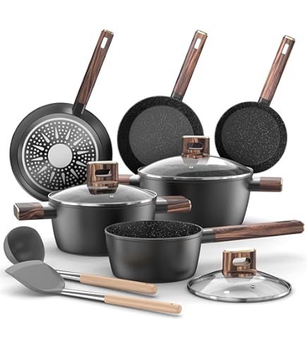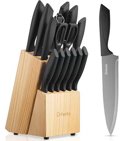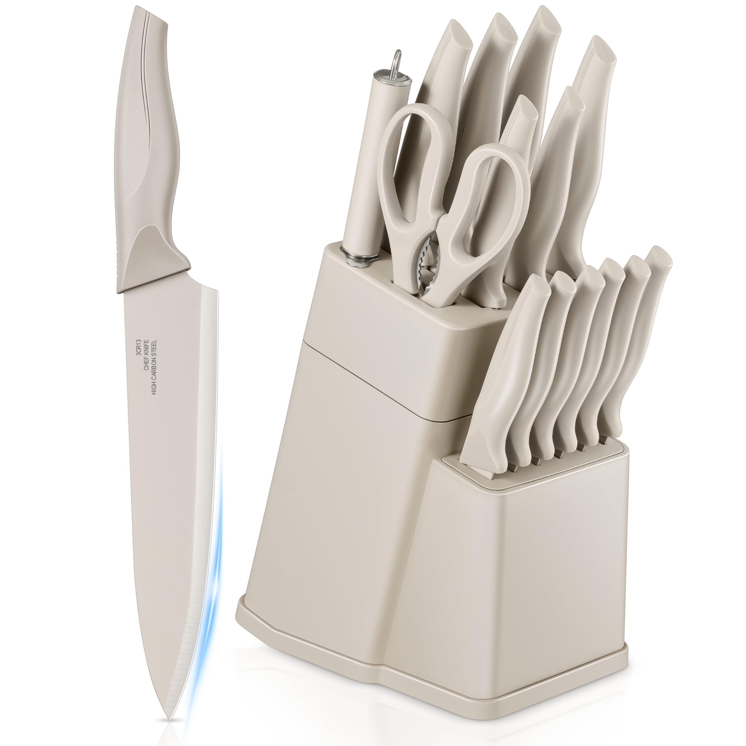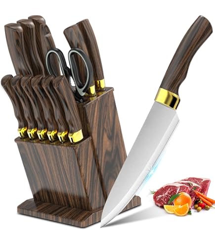Professionelles Schneiden in deiner Heimküche! Das Herogo 15-teilige Messer-Set im praktischen Block bietet alles, was du für die tägliche Essenszubereitung brauchst. Enthalten sind Santoku-Messer, Kochmesser, Brotmesser, Gemüsemesser, Universalmesser, 6 Steakmesser mit khaki-farbiger Zahnung, Küchenschere und ein integrierter Messerschärfer. Die Klingen aus kohlenstoffreichem Edelstahl sorgen für langanhaltende Schärfe und robuste Performance. Die Antihaftbeschichtung verhindert das Anhaften von Lebensmitteln und macht die Reinigung zum Kinderspiel. Die ergonomischen Griffe aus lebensmittelechtem PP-Material liegen perfekt in der Hand und ermüden auch bei längerer Nutzung nicht. Der kompakte Messerblock hält alle Messer sicher organisiert und griffbereit. Perfekt für das Schneiden von Fleisch, Gemüse, Brot und Fisch - dieses Set erfüllt alle Küchenanforderungen! Ein ideales Geschenk für Hobbyköche und alle, die Wert auf qualitativ hochwertige Küchenutensilien legen.