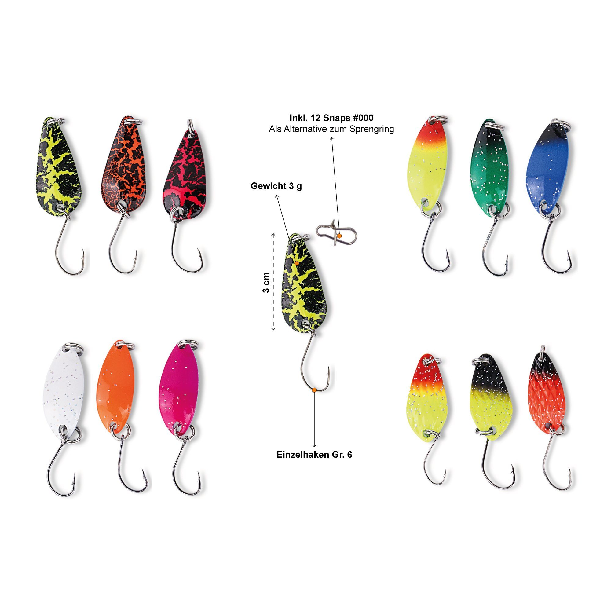 25 Teile, die deine Fangquote revolutionieren! Dieses EasyHooking Spoon Set ist perfekt für alle, die auf Barsch, Forelle, Hecht und Saibling angeln. Enthalten sind 11 klassische Forellen-Blinker, 1 UV-aktiver Blinker und 12 praktische Snaps - alles sicher verpackt in einer Köderbox. 🎣\n\nDie Blinker wiegen je 5 Gramm und haben eine aggressive Laufcharakteristik, die Fische einfach nicht widerstehen können. Der UV-aktive Köder sorgt auch bei trübem Wasser oder bewölktem Wetter für erfolgreiche Fänge.\n\nDie scharfen Einzelhaken mit Widerhaken garantieren, dass der Fisch auch wirklich hängen bleibt. Egal ob im Bach, Fluss oder See - diese Blinker haben sich bereits vielfach bewährt.\n\nAlles in einer praktischen Aufbewahrungsbox, sodass dein Angelzubehör immer ordentlich und griffbereit ist. Perfekt für Anfänger und erfahrene Angler gleichermaßen! Probiere es aus und erlebe, wie deine Bissfrequenz steigt. 🐟