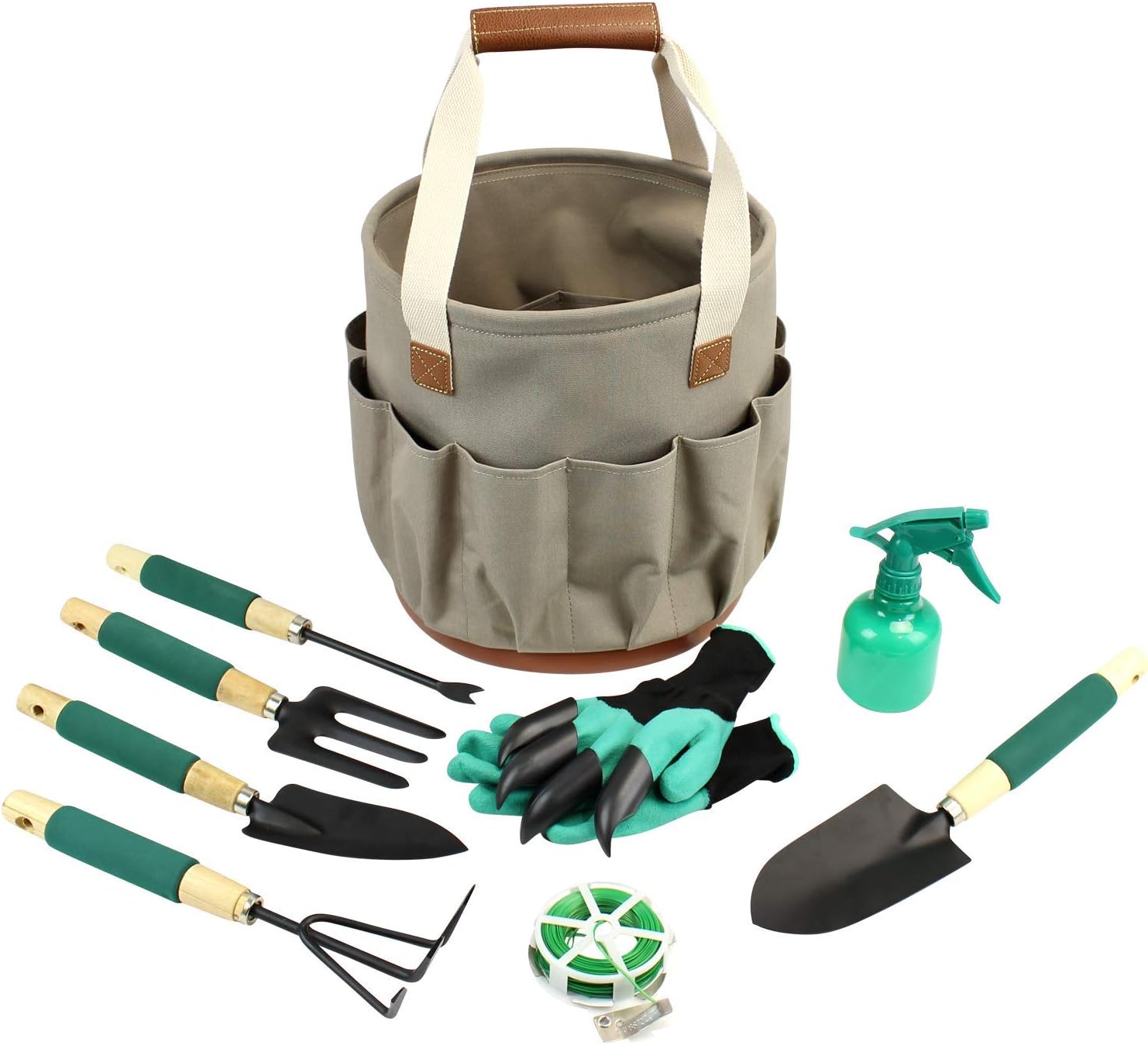 Enthält: Gartenkelle, Handharke, Umpflanzmaschine, Baumschere, Umtopf-Unterlage, Handschuhe und Gartentasche - komplett ausgestattet!