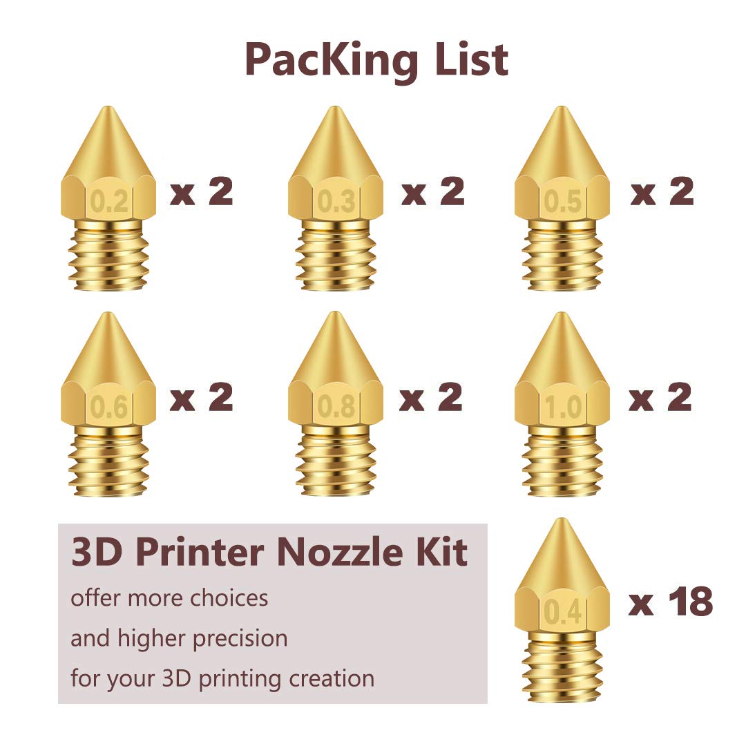 Perfektes Düsen-Set für deinen 3D-Drucker! Enthält 30 Stück in allen gängigen Größen: 0,2mm, 0,3mm, 0,4mm (18 Stück!), 0,5mm, 0,6mm, 0,8mm und 1,0mm. Aus hochwertigem Messing mit goldfarbener Oberfläche. Super kompatibel mit den meisten Druckern wie CR-10, Ender-3, Anet A8 und Makerbot. Jede Düse hat die Größe eingraviert - total praktisch! Mit M6 Gewinde und 6mm Sechskant. Wichtig: Nach dem Wechsel unbedingt den Abstand zur Bauplatte neu kalibrieren für perfekte Druckergebnisse. Kommt in einer praktischen Aufbewahrungsbox. Und falls mal was nicht passt: 1 Monat Rückgaberecht! Ein Must-Have für jeden 3D-Druck-Enthusiasten.