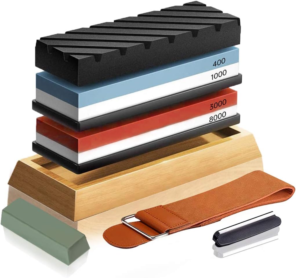 Boah, dieses Schleifstein-Set ist genau das Richtige, um deine Messer wieder richtig scharf zu kriegen! Der doppelseitige Wetzstein hat eine 3000er Körnung für den Grobschliff und eine 8000er für den Feinschliff - damit werden selbst stumpfe Messer wieder rasierscharf. Das coole dabei: Die rutschfeste Bambusbasis hält alles sicher an Ort und Stelle. Besonders praktisch für Einsteiger ist die Winkelführung mit 14°, 17° und 20° Einstellungen - so bekommst du immer den perfekten Winkel hin. Einfach den Stein 10-15 Minuten in Wasser einweichen (kein Öl nötig!) und los geht's. Im Set findest du auch einen Korrekturstein für die Pflege der Schleifstein-Oberfläche. Egal ob Küchenmesser, Scheren oder Taschenmesser - damit machst du alles wieder fit. Sogar deine Gartenwerkzeuge kannst du damit schärfen!