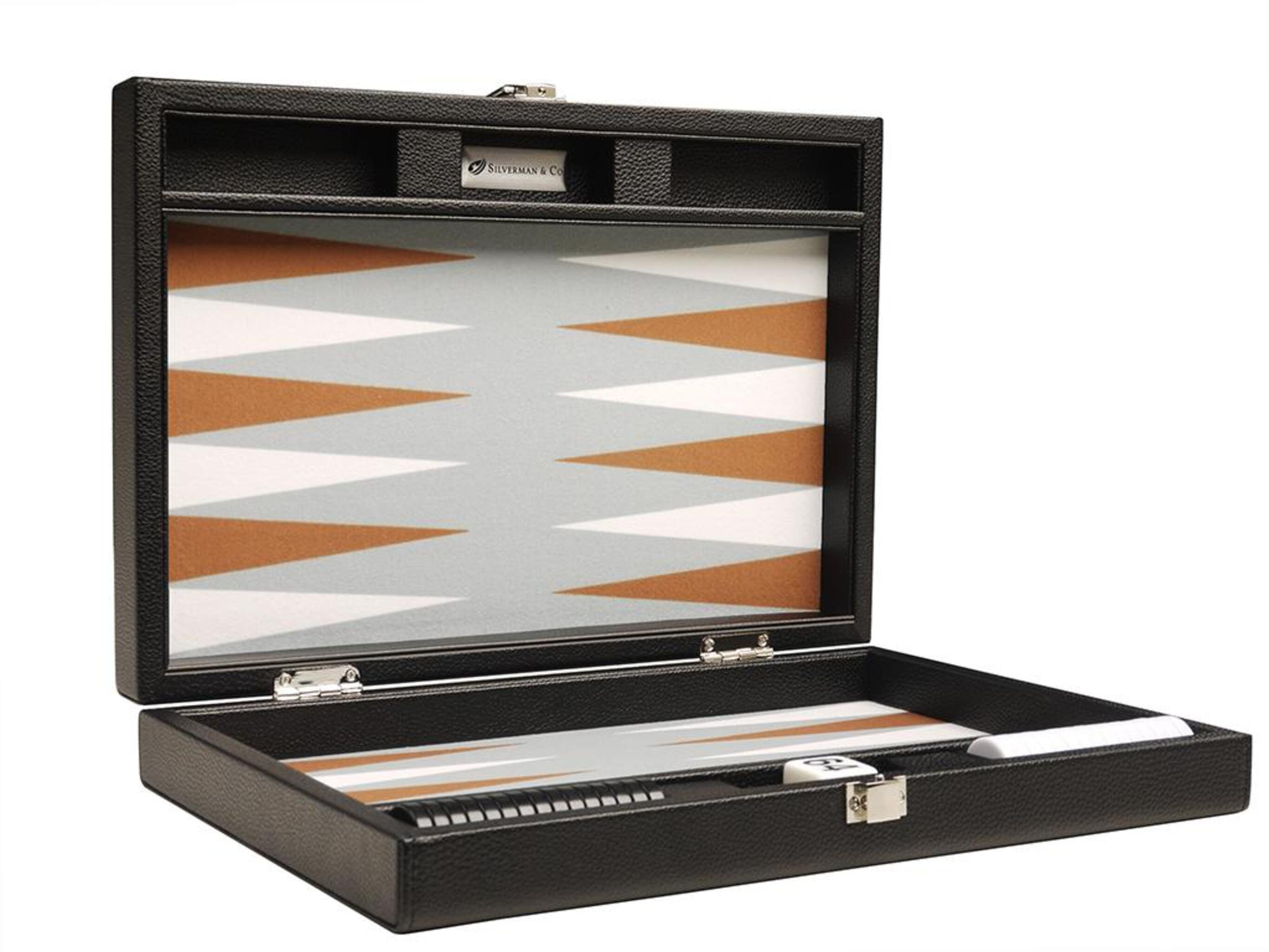 Würfel dich zum Sieg! Dieses elegante Silverman & Co. Backgammon Set in Reisegröße (33cm) vereint Luxus und Praktikabilität. Das schwarze Brett mit weißen und astralblauen Punkten sieht einfach klasse aus. Aus hochwertigem Kunstleder gefertigt, mit ultrafeinem Filz für ein perfektes Spielgefühl. Die 2,5cm großen Spielsteine gleiten sanft über das Board und finden platzsparend in den Seitenfächern Platz. Inklusive ergonomischem Würfelbecher mit Filzfutter für leises Würfeln und einem großen Doppelwürfel. Der stabile Riegel und der robuste Griff machen es zum perfekten Reisebegleiter. Ob für gemütliche Spieleabende zu Hause oder unterwegs - dieses Backgammon Set begeistert Anfänger und Profis gleichermaßen. Ein Spielspaß, der Generationen überdauert!