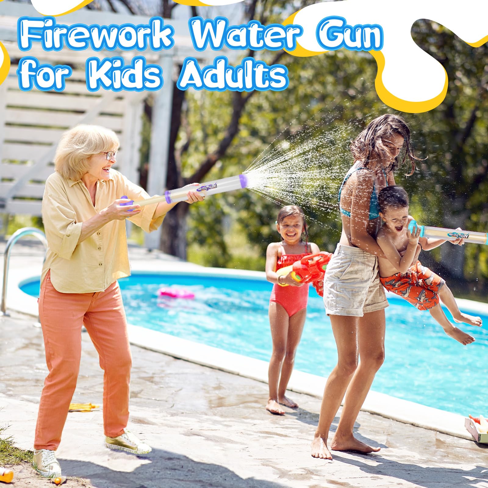 Wasserschlacht-Alarm! Diese 4 coolen Wasserpistolen mit Feuerwerk-Effekt bringen Mega-Spaß im Sommer. Jede Pistole leuchtet in anderen Farben (Gelb, Rosa, Lila, Blau) und spritzt Wasser bis zu 10 Meter weit! Einfach Wassertank füllen, Griff drücken und ab geht die Post! Aus hochwertigem Kunststoff, ergonomisch geformt für kleine Hände. Perfekt für den Pool, Strand, Garten oder Badezimmer. Die 40cm langen Pistolen sind ideal für Kinder von 3-10 Jahren. So wird jeder Sommertag zum Abenteuer - ob alleine oder mit Freunden. Die auslaufsichere Konstruktion sorgt für langanhaltenden Spielspaß. Perfektes Geschenk für Geburtstage oder einfach so!