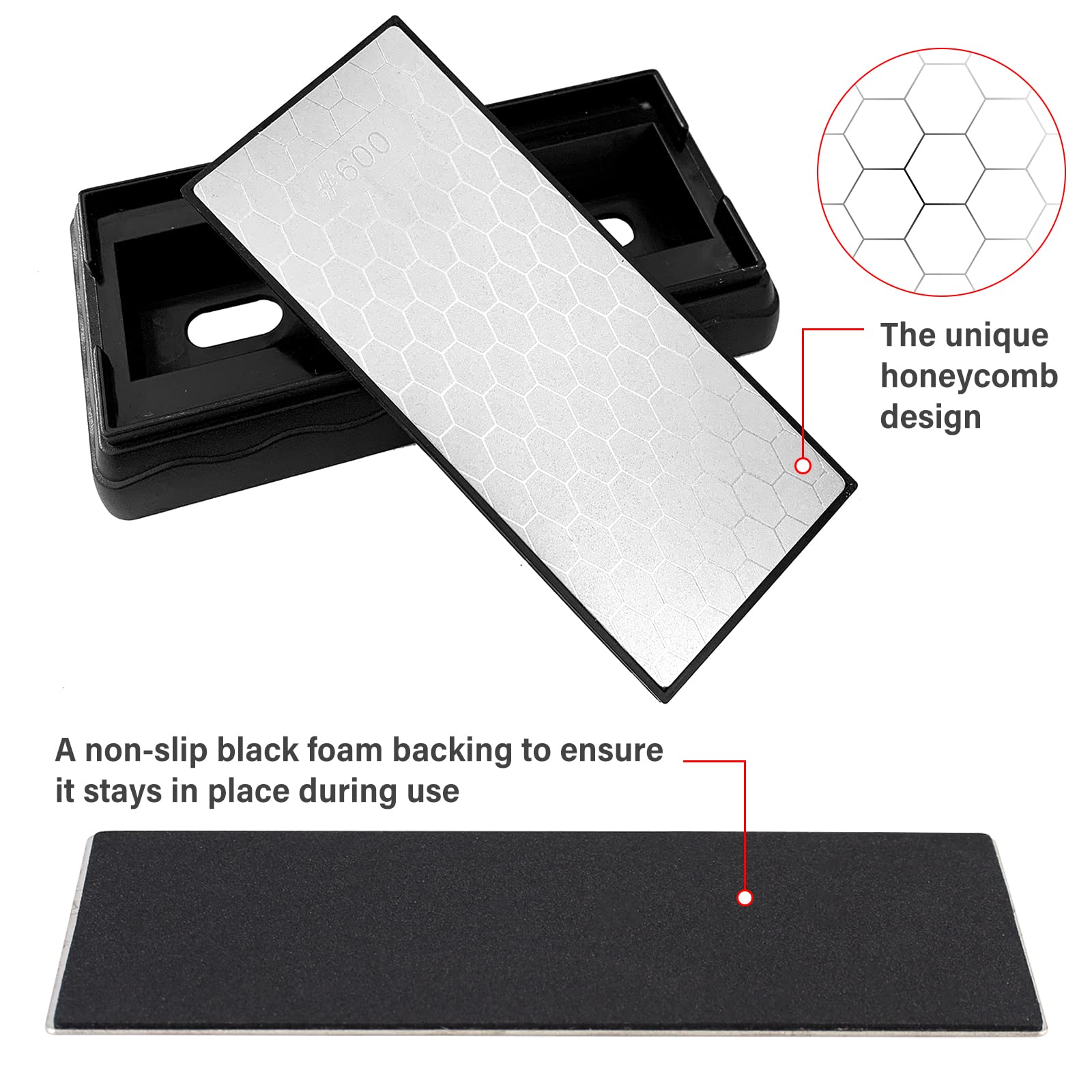 Mach deine Messer wieder rasiermesserscharf! Dieses 5-teilige Diamant-Schleifstein-Set von KQDRAVINE hat alles was du brauchst: 400, 600, 800, 1000 und 1200 Körnung - von grob bis fein. Die Diamant-Beschichtung ist ultra-hart und hält ewig. Das Waben-Design auf der Oberfläche sorgt für super Schärfleistung. Einfach das Messer im 30° Winkel hin und her bewegen - eventuell etwas Wasser zur Schmierung dazu. Jeder Stein ist nur 2mm dick - ultra-dünn und leicht. Perfekt für unterwegs: Camping, Gartenarbeit, Outdoor-Trips. Aber natürlich auch ideal für Küchenmesser, Scheren, Meißel - eigentlich alle scharfen Werkzeuge. Die Korrosionsbeständigkeit ist top - kein Rost! Ob Profi-Koch oder Hobby-Handwerker - mit diesem Set bekommst du alles wieder scharf. Qualität die sich lohnt - und das zu nem unschlagbaren Preis!