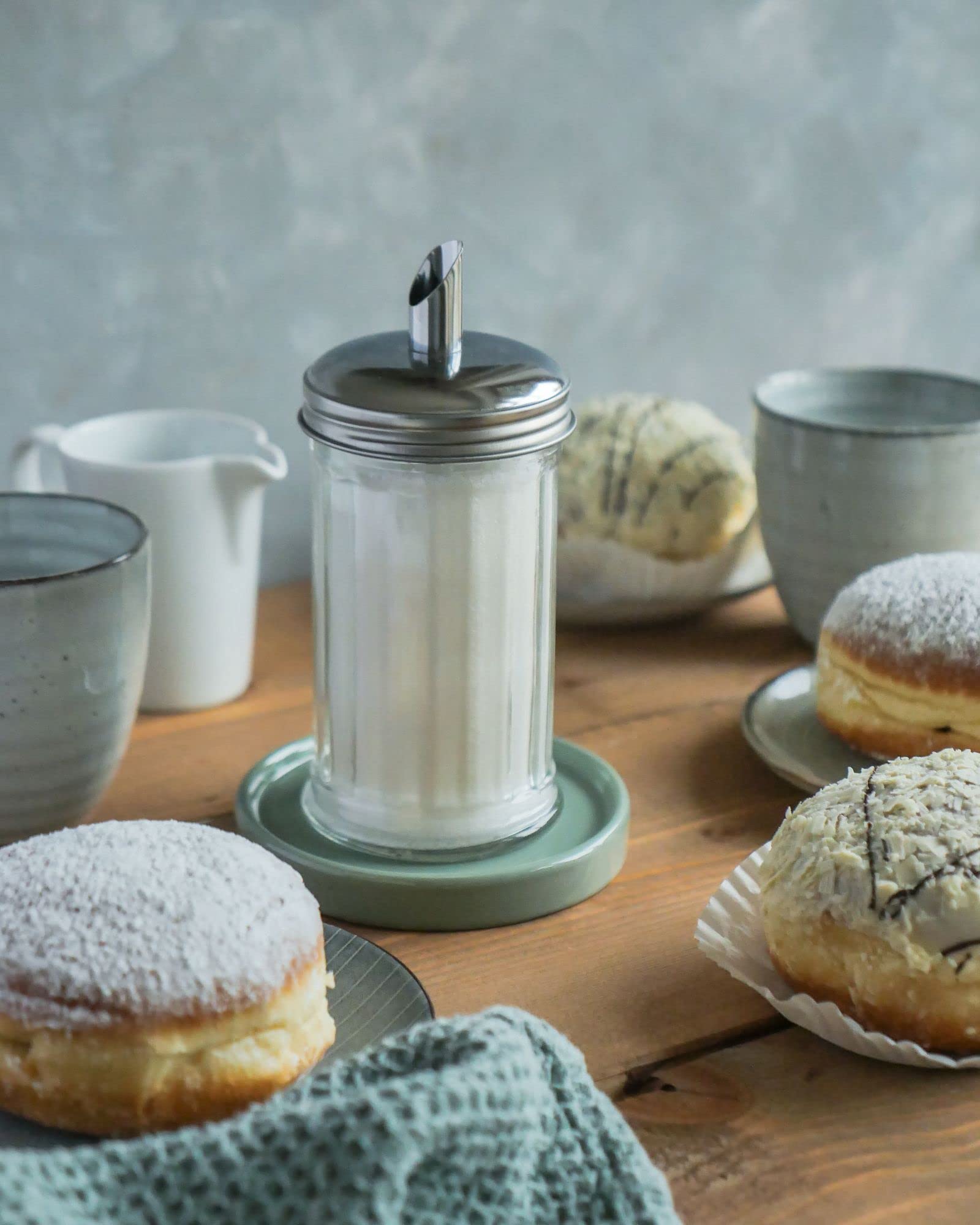 Dieses Zuckerstreuer-Set macht deine Küche richtig stylisch! 5 praktische Behälter aus Glas mit Edelstahl-Deckeln - jeder 350 ml groß. Die Klappe lässt sich easy öffnen, kein Verklemmen wie bei Drehdeckeln. Perfekt für Zucker, Salz, Pfeffer oder andere Gewürze. Das klare Glas zeigt dir sofort, wann nachgefüllt werden muss. Luftdicht verschlossen - alles bleibt frisch und trocken. Maße: 6,7x6,7x13 cm - nicht zu groß, nicht zu klein. Sieht aus wie in einem richtigen Café! Einfach reinigen, spülmaschinengeeignet. Super Geschenkidee für Einzug, Geburtstag oder einfach so. Mach deine Küche organisiert und schick - ohne großen Aufwand. So macht Kochen und Backen gleich doppelt Spaß!