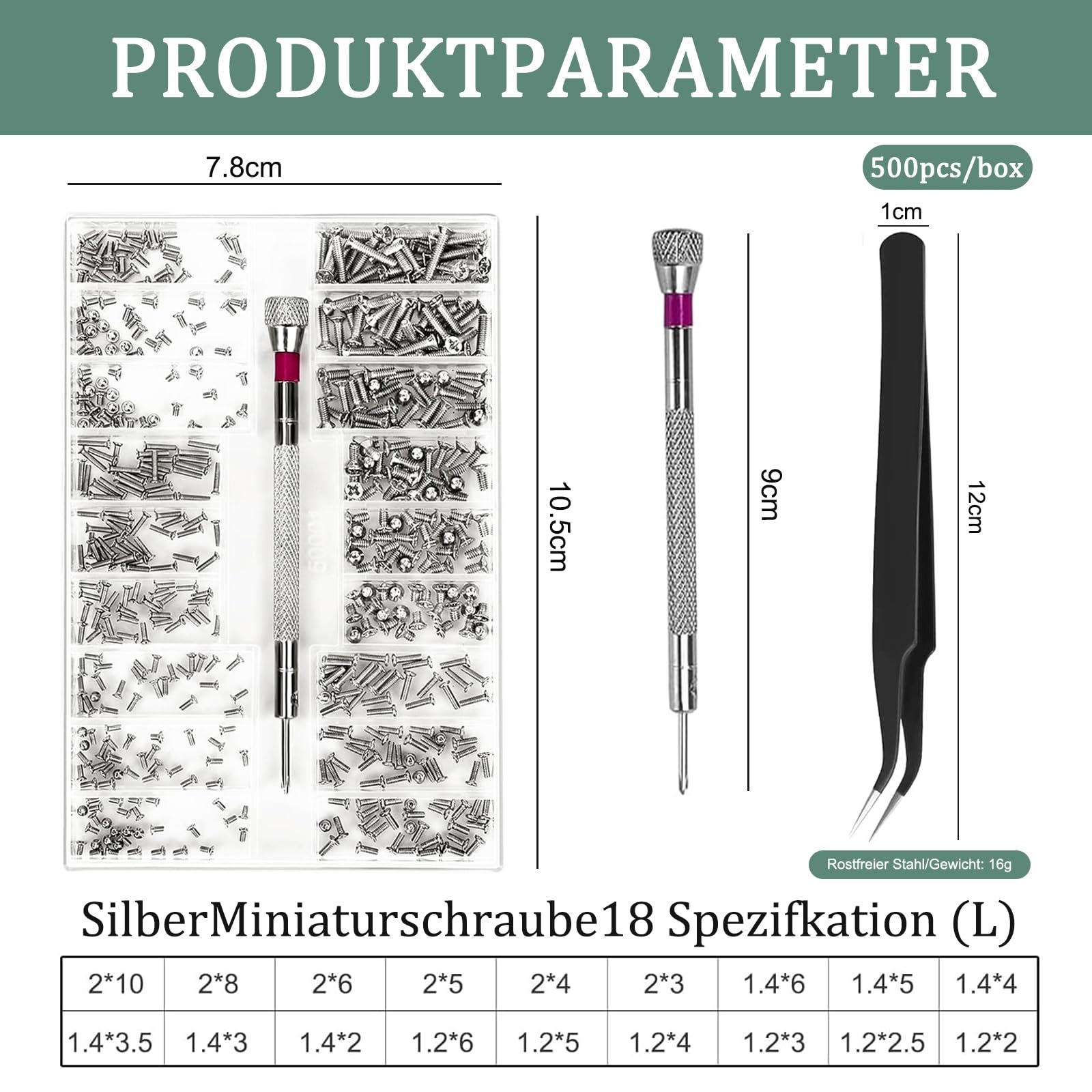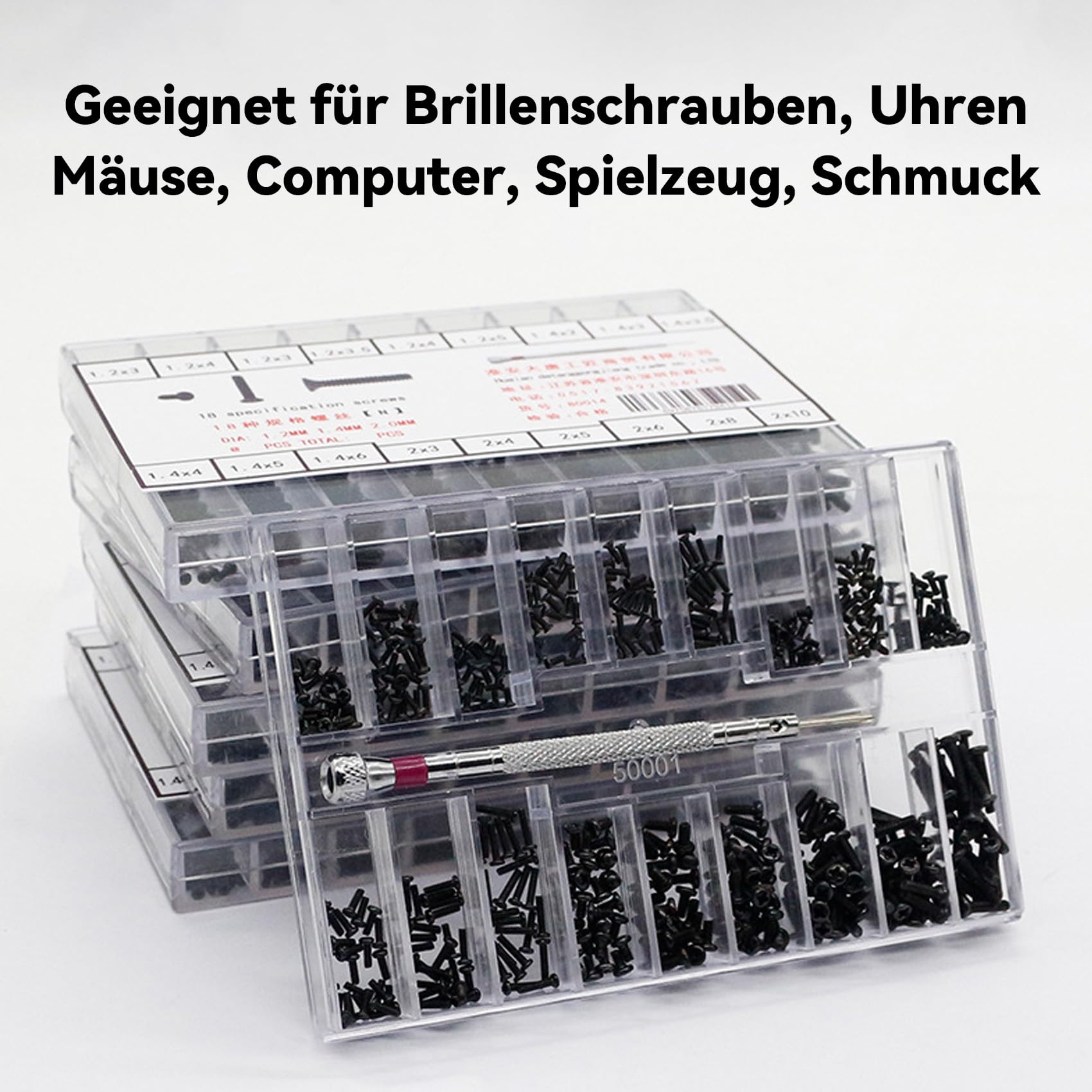 Boah, dieses Schrauben-Sortiment ist ein echter Lebensretter für alle, die mal winzige Schrauben brauchen! 500 Teile in 18 verschiedenen Größen - von M1.2 über M1.4 bis M2, in Längen von 2mm bis 10mm. Alles aus robustem Kohlenstoffstahl, der nicht so schnell bricht oder sich verbiegt. Die Schrauben haben Kreuzschlitz-Köpfe (Rundkopf, Senkkopf, Flachkopf) und lassen sich leicht festziehen. Im Lieferumfang ist sogar ein Schraubendreher und eine Pinzette dabei - also alles, was du brauchst! Perfekt organisiert in einer transparenten Box mit Fachunterteilung, findest du immer sofort die richtige Schraube. Ideal für die Reparatur von Brillen, Sonnenbrillen, Laptops, Handys, Uhren und anderen kleinen Geräten. Nie wieder suchen oder improvisieren müssen! Ein Must-Have für jede Werkstatt, jeden Haushalt oder Hobby-Bastler. Spare Zeit und Nerven - mit diesem Set hast du immer die passende Schraube parat. Einfach genial!