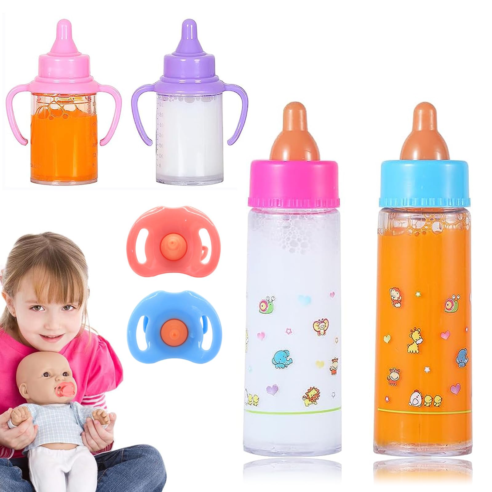 Für alle kleinen Puppenmamis: Dieses 8-teilige Puppenzubehör-Set macht das Puppenspiel noch realistischer! Im Set enthalten sind 4 magische Milchflaschen, 2 Schnuller und 2 weiche Lätzchen. Das Besondere an den Flaschen: Sie sind magisch! Wenn du sie umdrehst, verschwindet die Flüssigkeit wie von Zauberhand - total faszinierend für Kinder. Aus hochwertigem ABS-Material und weichen Stoffen gefertigt, ist das Spielzeug sicher und langlebig. Kinder lernen spielerisch Verantwortung, Empathie und Feinmotorik, während sie ihre Puppen füttern und pflegen. Perfekt für Rollenspiele und um die Fantasie anzuregen. Ein ideales Geschenk für Kinder ab 3 Jahren zu Weihnachten, Geburtstagen oder einfach so. Aber Achtung: Enthält kleine Teile, daher nicht für Kinder unter 3 Jahren geeignet und immer unter Aufsicht von Erwachsenen verwenden. Mach deinem Kind eine Freude und bereichere seine Puppenwelt mit diesem tollen Zubehör-Set!