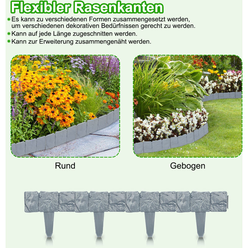 Dieses Steinkanten-Set ist total einfach zu installieren - ganz ohne Graben! Einfach hinstellen und schon hast du eine saubere Trennung zwischen Rasen, Blumenbeeten und Wegen. Die Kanten sehen aus wie echter Stein, sind aber viel leichter und trotzdem mega-stabil. Sie halten jedem Wetter stand - ob pralle Sonne oder Frost, die Farbe verblasst nicht und es gibt keine Risse. Perfekt für alle, die ihren Garten schnell und unkompliziert aufwerten wollen. Maße pro Element: ca. 33,5x4x12,5 cm. Inhalt: 8 Steinkanten. Material: PP. Wetterfest und langlebig - hält viele Jahre!