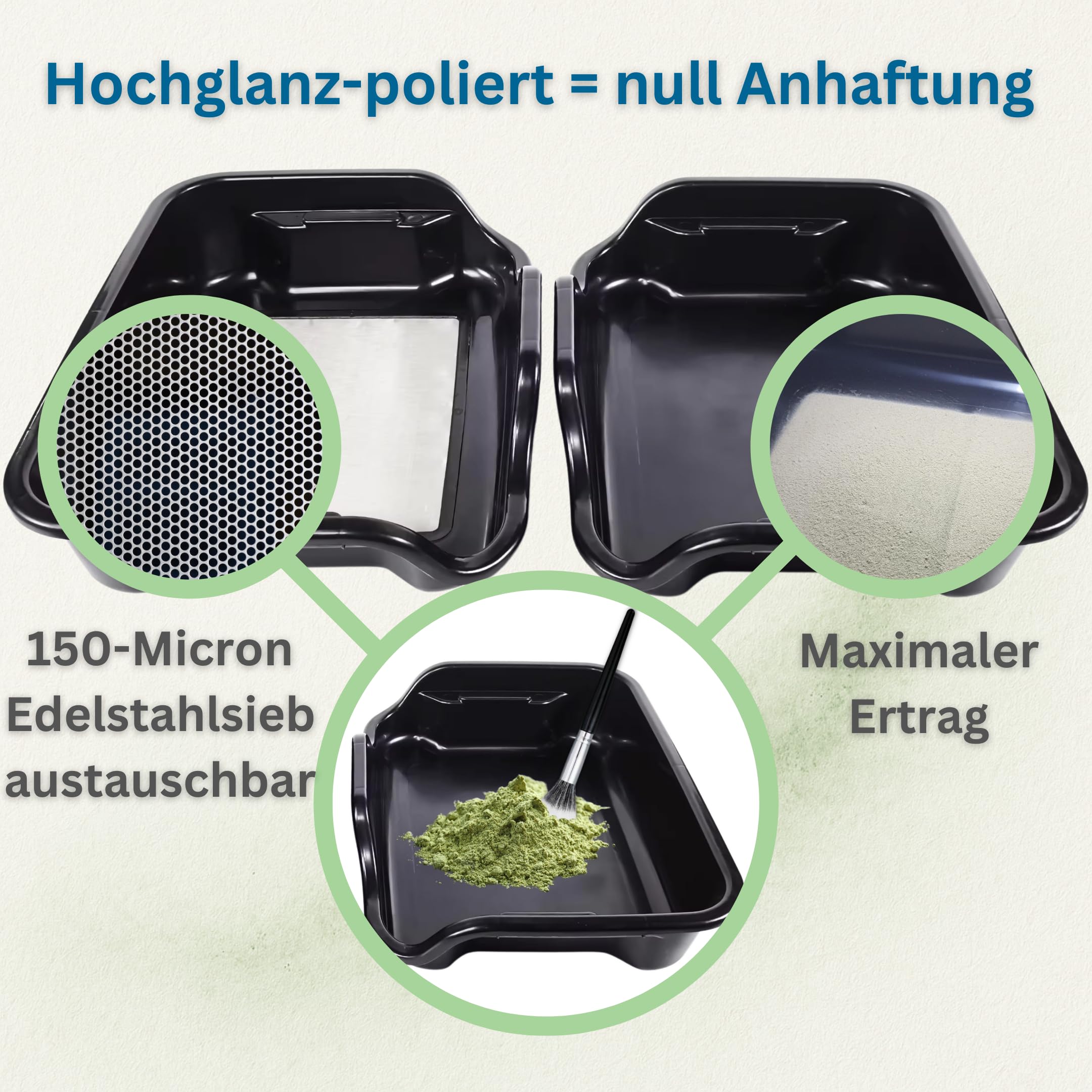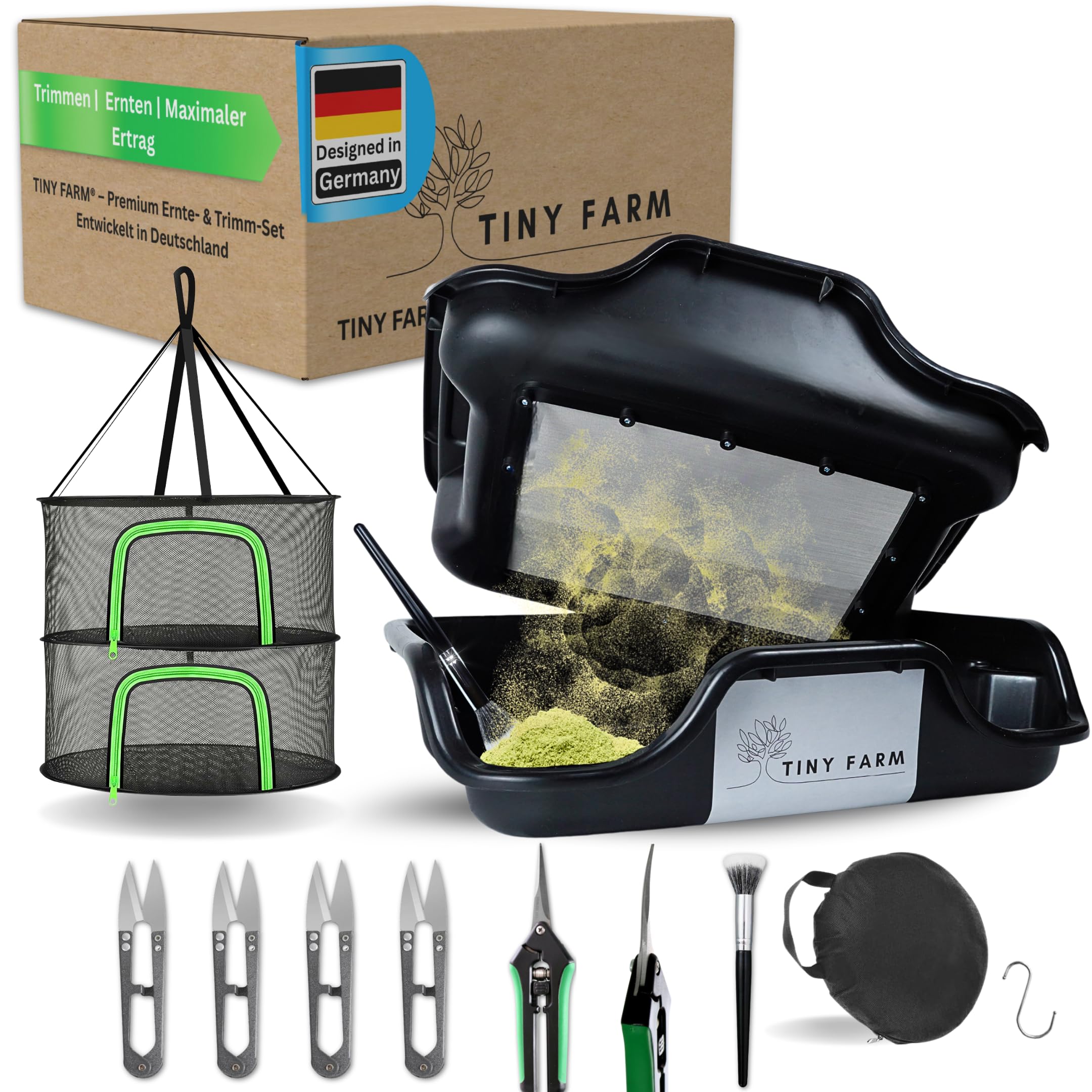 Hey Grower! Dieses 9-teilige Trimmset von Yaocom ist dein komplettes Arbeits-Setup in einer Box! Aus robustem Edelstahl - spülmaschinengeeignet und super langlebig. Das 150 Mikrometer feine Sieb fängt alle wertvollen Trichome auf. Dabei: gerade und gebogene Scheren für schwer erreichbare Stellen, Lupenkarte zur Kontrolle, Mini-Hygrometer fürs Klima, plus Schaber und Bürste. Alles hat seinen Platz in den praktischen Staufächern. Maße: 30x30x5 cm - passt auf jeden Tisch und ist trotzdem portabel. Nicht nur für Cannabis, sondern auch für Kräuter, Tee und Gewürze. Endlich Ordnung beim Trimming! Kein Plastik-Gedöns, das nach einer Saison kaputt geht. Metallisch-silberne Optik, professionelle Ausstattung. Mach deine Ernte zum effizienten Erlebnis - ob Anfänger oder Profi!