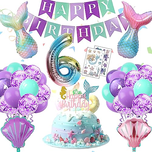 Tauch ein in die magische Welt der Meerjungfrauen! Dieses komplett Party-Set macht jede Geburtstagsfeier unvergesslich. Enthalten sind: 1 Happy Birthday-Banner, 1 Tortenaufleger, 12 Cupcake-Aufleger, 16 bunte Latexballons, 1 Meerjungfrauen-Balloon, 1 spezieller Meerjungfrauen-Luftballon, 6 Sterne-Ballons und 2 Muschel-Schwanz-Balloons. Alles in super Qualität - die Banner und Kuchen-Deko sind aus festem Karton mit knalligen Farben, die Ballons aus robustem Latex. Mega einfach aufzubauen, in wenigen Minuten ist deine Party location verwandelt! Perfekt nicht nur für Geburtstage, sondern auch für Babypartys, Weihnachtsfeiern oder einfach als hübsche Zimmerdekoration. Deine kleine Prinzessin wird Augen machen!