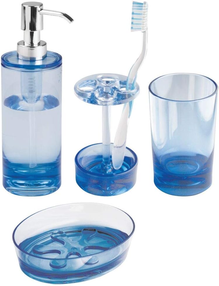Bring Ordnung und Style in dein Badezimmer! Dieses praktische 4-teilige Set in modernem Blau umfasst alles, was du für eine aufgeräumte Bad-Einrichtung brauchst: einen Seifenspender, einen Zahnputzbecher, einen Zahnbürstenhalter und eine praktische Seifenschale. Hergestellt aus hochwertigem PP-Kunststoff sind alle Teile robust, langlebig und pflegeleicht. Der Zahnbürstenhalter bietet Platz für zwei Zahnbürsten plus Zahnpasta - alles griffbereit und hygienisch. Die Seifenschale hat einen cleveren Ablauf, damit die Seife nicht im Wasser liegen bleibt und länger hält. Der Seifenspender mit zuverlässiger Pumpe gibt genau die richtige Menge Flüssigseife ab - kein Kleckern mehr! Alle Teile haben abgerundete Ecken und sind einfach zu reinigen. Die Maße sind perfekt aufeinander abgestimmt: Seifenspender ca. 17x7,5cm, Waschbecher ca. 11x7,5cm, Zahnbürstenbecher ca. 11,5x7,5cm und die Seifenschale ca. 13x9,5x2,5cm. So nehmen sie nicht zu viel Platz weg, sind aber trotzdem geräumig genug. Das Set macht nicht nur dein Bad ordentlicher, sondern sieht auch noch super aus! Perfekt für Gäste-WC, Familienbad oder Studentenwohnung - überall wo praktische und stylische Organisation gefragt ist.