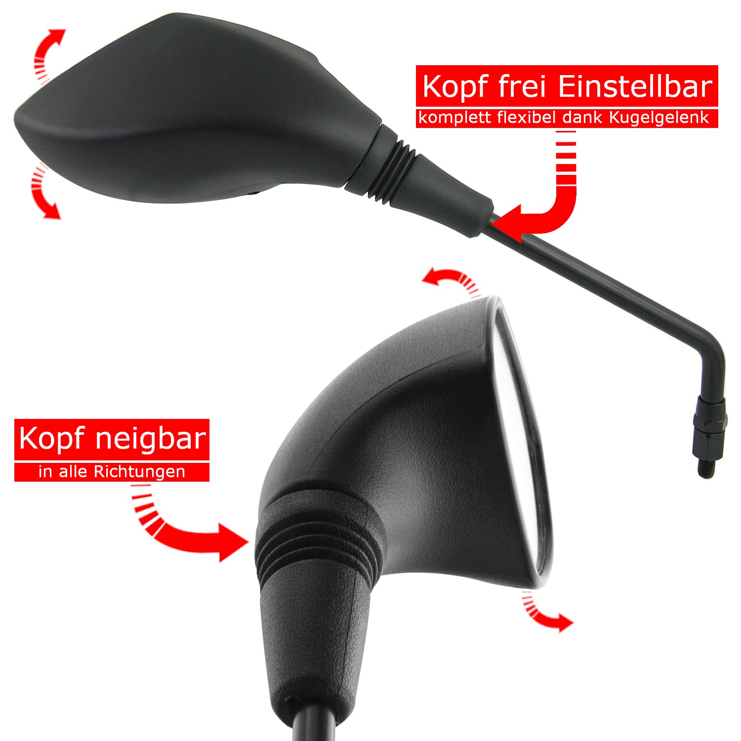 Stylische Rückspiegel für deinen Motorroller oder dein Motorrad! Dieses Area1 Set mit zwei Spiegeln im sportlichen F1-Look mit Carbon-Muster sieht einfach klasse aus. Mit E-Zeichen - komplett legal und keine Eintragung nötig! Die Spiegelarme sind aus lackiertem Stahl, die Köpfe aus hochwertigem Kunststoff. Das Kugelgelenk ermöglicht viele Einstellmöglichkeiten. Inklusive 5 Adapter für 8mm und 10mm Gewinde - passt auf fast alle Modelle! Perfekt als Ersatz oder fürs Tuning. Area1 Qualität mit 2 Jahren Garantie - da machst du nichts falsch!