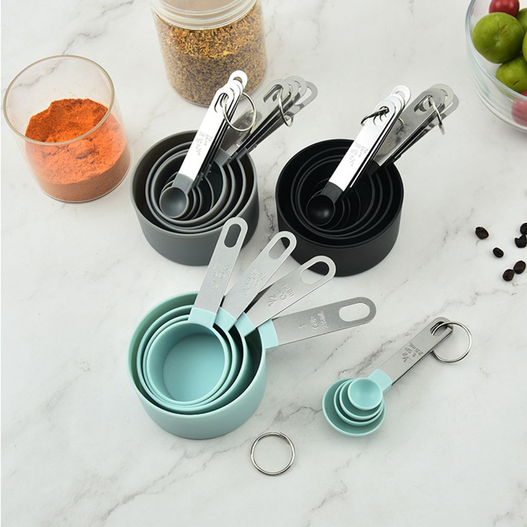 Endlich Ordnung in der Küche mit diesem praktischen 8-teiligen Messbecher-Set! Aus hochwertigem 430 Edelstahl gefertigt, rostfrei und spülmaschinengeeignet. Das Set enthält: 250ml Becher, 125ml (1/2 Tasse), 80ml (1/3 Tasse), 60ml (1/4 Tasse), sowie 15ml EL, 5ml TL, 2,5ml (1/2 TL) und 1,25ml (1/4 TL). Alle Maße sind lasergraviert - verblassen nicht und sind immer gut lesbar. Die Becher und Löffel sind stapelbar und werden an einer abnehmbaren Schlaufe geliefert, sodass sie platzsparend verstaut werden können. Perfekt zum Backen, Kochen oder für die Zubereitung von Cocktails. Die schwarze Oberfläche ist antihaftbeschichtet und sieht dabei noch super stylisch aus. Ein Must-Have für jede Küche - ob für Profi-Köche oder Hobby-Bäcker!