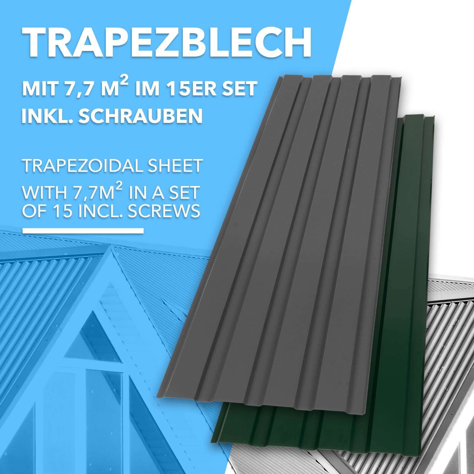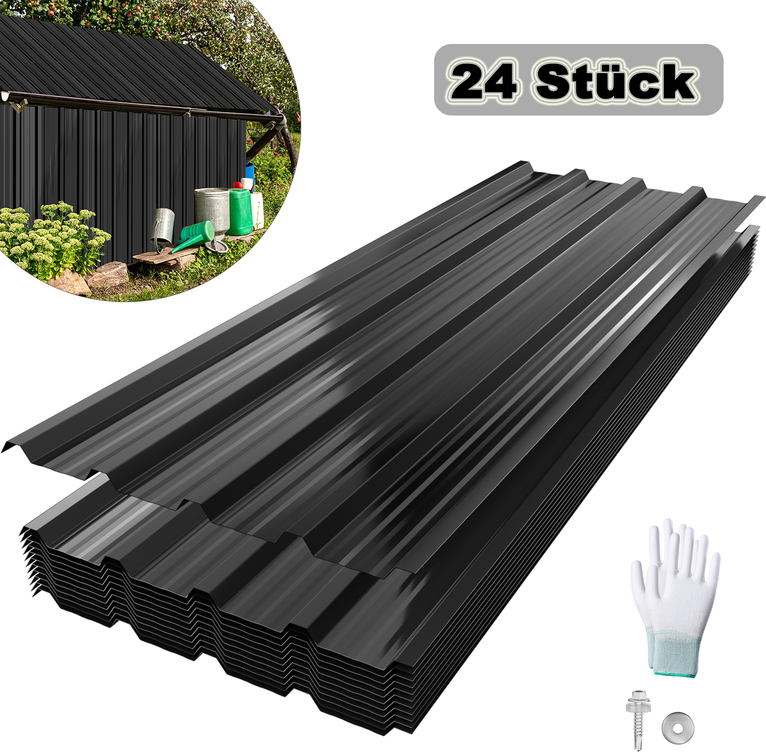 Perfektes Dachblech-Set für dein Carport oder Gerätehaus! 24 Trapezbleche aus verzinktem Stahl, jeweils 115x45cm groß - zusammen ganze 12,4m² Fläche. Nur 0,25mm dick aber dennoch stabil und witterungsbeständig. In schwarz erhältlich, sieht super aus und schützt zuverlässig. Die Rillen leiten Wasser effektiv ab, keine Staunässe! Im Lieferumfang sind 240 Schrauben mit Unterlegscheiben und CE-zertifizierte Handschuhe enthalten - alles für die einfache Montage. Die Bleche sind stapelbar, platzsparend zu lagern und transportieren. Einfach zuschneidbar für individuelle Projekte. Ob für Carport, Gerätehaus, Gartenhaus oder Gewächshaus - mit diesen Blechen bist du bestens ausgestattet. Einfach montieren und jahrelang von qualitativ hochwertiger Abdeckung profitieren!