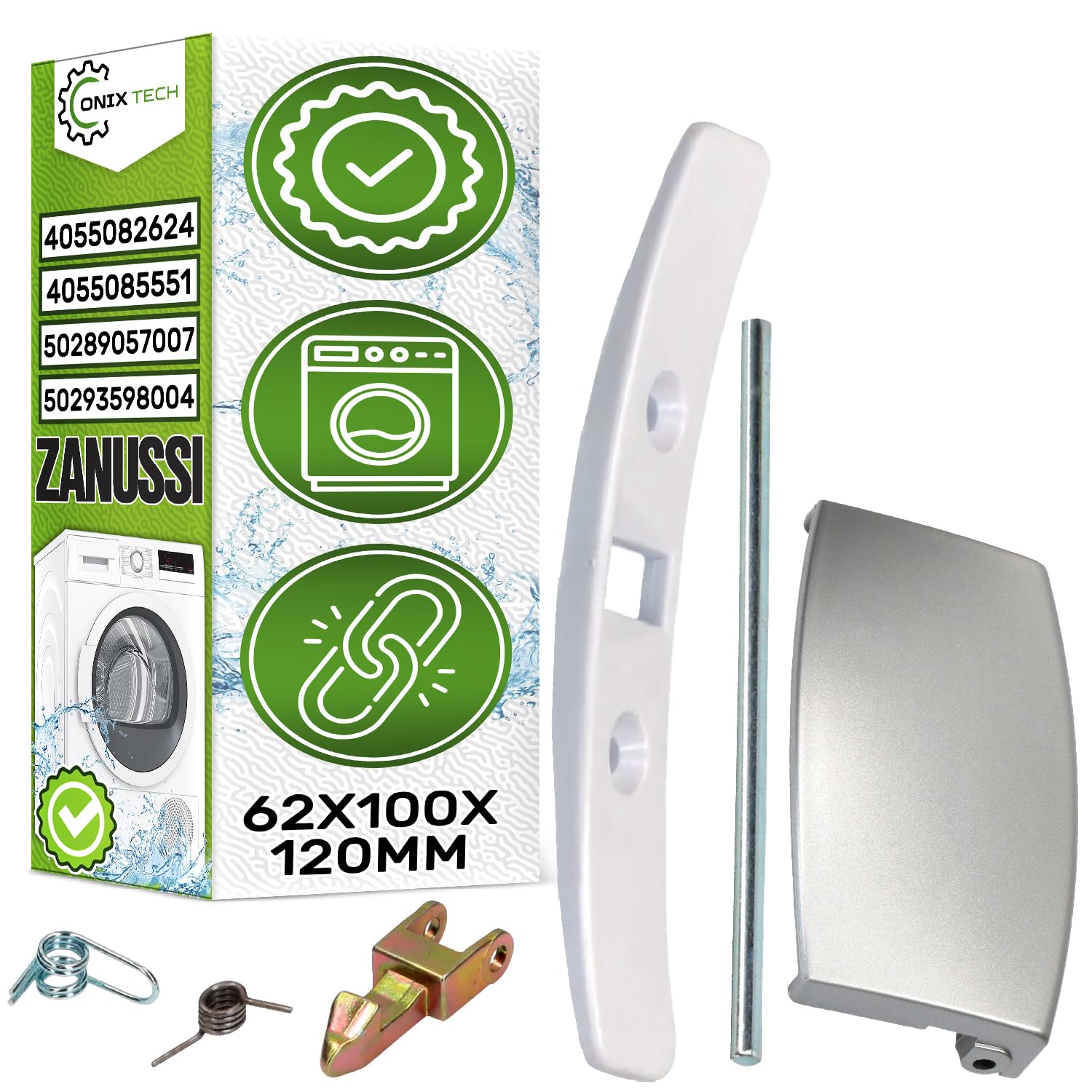 Oh nein, ist der Griff deiner Waschmaschine kaputt? Kein Problem! Dieses Griff-Set von MONTERAL passt für viele Electrolux, AEG, Juno, Zanker und Zanussi Modelle. Die Originalcodes sind 4055085551, 405508555/1, 4055082624, 405508262/4, 50289057007, 5028905700/7, 50293598004 und 5029359800/4 - am besten vergleichst du sie mit deinem Gerät. Im Set ist alles dabei, was du zum Wechseln brauchst: Türgriff (100 mm lang, 62 mm breit), Verbindungspinne (100 x 4 mm), Flanschplatte (120 mm), Verriegelungsbügel, Spiralfeder und Hakenspringfeder. Wenn dein Griff gebrochen ist, die Tür wackelt oder der Mechanismus klemmt, ist es Zeit für einen Austausch. So vermeidest du größere Schäden und deine Waschmaschine läuft wieder rund. Die Montage ist nicht schwer, aber wenn du unsicher bist, frag lieber einen Profi. Mit 10 Jahren Garantie bist du auf der sicheren Seite. Also, bestelle das Set und mach deine Waschmaschine wieder fit. Bei Fragen helfen wir dir gerne bei der Auswahl!