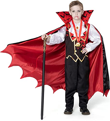 Wow, dieses Vampir-Kostüm-Set für Kinder ist ja mal richtig gruselig-cool! Komplett mit Vampir-Umhang, Top, Hose, Vampir-Zähnen, Fledermaus-Tattoo-Aufklebern und Vampir-Halskette - da fehlt nix! Aus hochwertigen Materialien gefertigt - weich auf der Haut und trotzdem robust. Der Umhang hat coole Halloween-Motive mit dunklen Schloss-Szenen und Fledermäusen. Die Tattoo-Aufkleber leuchten richtig gut und die Vampir-Zähne geben den letzten Grusel-Faktor! Damit wird dein Kind zum echten Graf Dracula - avantgardistisch und total im Trend. Perfekt für Halloween, Karneval, Mottopartys oder einfach nur zum Verkleisen. Mit der Größentabelle findest du easy die richtige Passform - Komfort und Style gehen Hand in Hand. Einfach mal ausprobieren und in die Rolle eines blutrünstigen Vampirs schlüpfen! Da machen die Kids sicher große Augen und haben ne Menge Spaß. Auch super als Geschenkidee - da ist die Freude garantiert! Einfach um die Fantasie so richtig ausleben zu lassen.