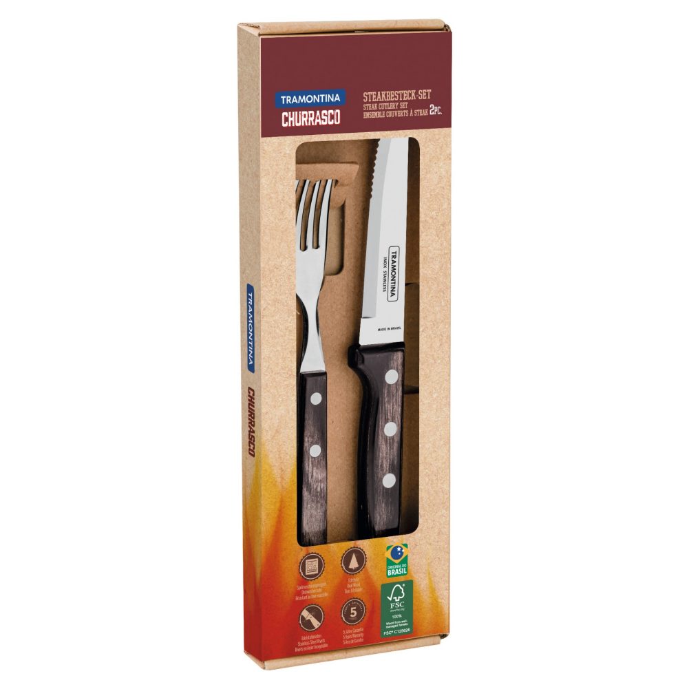 Dieses 6-teilige Steakgabel-Set von Tramontina ist einfach spitze für jeden Grillabend! Jede Gabel ist 21 cm lang und aus rostfreiem Edelstahl AISI 430 gefertigt - also absolut pflegeleicht und spülmaschinenfest. Die wunderschönen roten Holzgriffe sind FSC-zertifiziert und liegen ergonomisch perfekt in der Hand. Tramontina steht seit 1911 für brasilianische Qualität - das merkt man diesen Gabeln sofort an! Perfekt als Ergänzung zu den Gaucho-Steakmessern oder auch solo einsetzbar. Ob für saftige Steaks, Entrecôte oder auch für Pizza und Flammkuchen - diese Gabeln machen jedes Essen zum Erlebnis. Der rustikale Charme verleiht deinem gedeckten Tisch sofort südamerikanisches Flair. Hergestellt in Brasilien mit der Leidenschaft für gutes Essen. Einfach auspacken, waschen und schon kannst du deine Gäste beeindrucken. Macht aus jedem Grillabend ein besonderes Event! Auch super als Geschenk für Grill-Liebhaber - Qualität die man sieht und spürt.