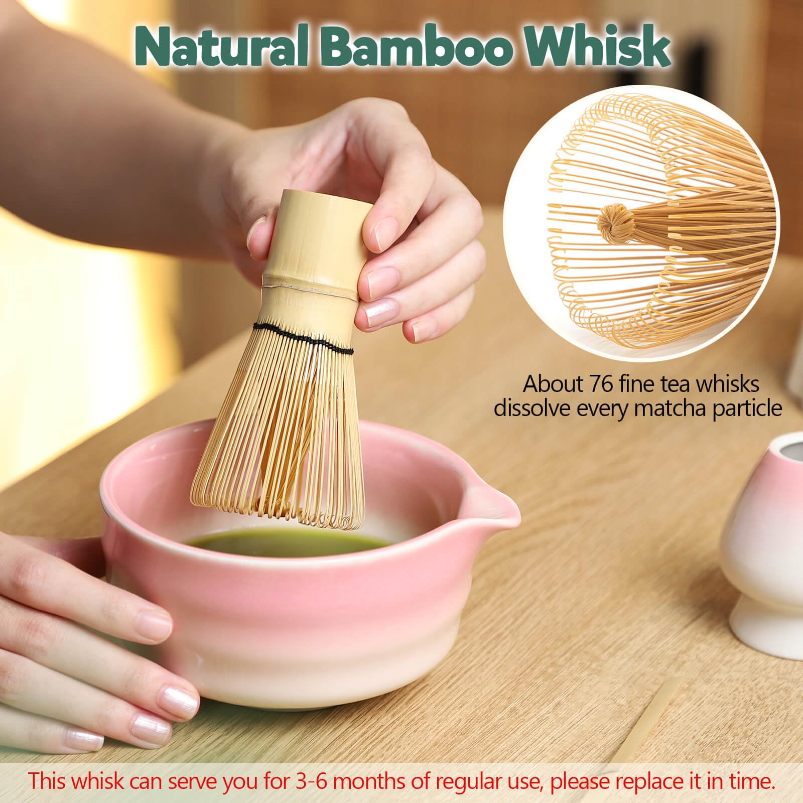 Dieses wunderschöne rosa Matcha Set lässt jedes Tee-Herz höher schlagen! Es ist komplett ausgestattet mit allem, was du für eine traditionelle Matcha-Zeremonie brauchst: Schale (500ml), Sieb, Bambus-Löffel, Matcha-Besen mit 76 Borsten, Besenhalter, Löffelhalter und sogar ein Teehandtuch. Der rosa Farbverlauf sieht einfach traumhaft aus und macht jeden Matcha-Moment besonders. Mit dem Besen kriegst du ganz easy diesen cremigen, schaumigen Matcha hin - einfach in W-Form rühren! Die Keramik-Halter sorgen dafür, dass alles hygienisch bleibt. Ein absolutes Traum-Geschenk für Tee-Liebhaber oder einfach für dich selbst, um abends mal richtig zu entspannen.