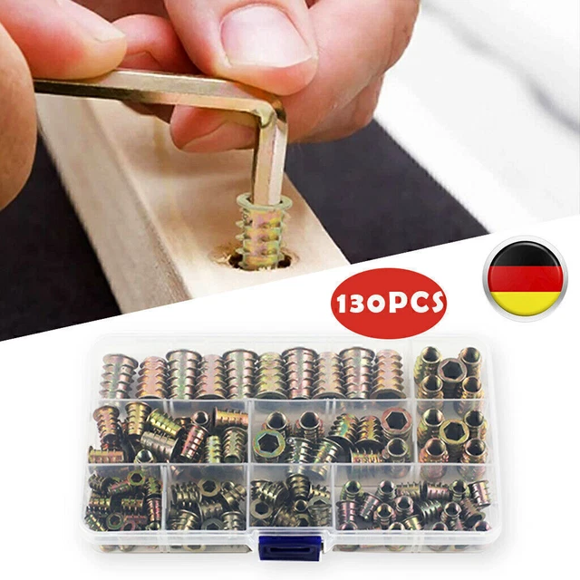 Die Lösung für stabile Möbelverbindungen! Dieses umfangreiche Set mit 230 Einschraubmuttern in 11 verschiedenen Größen ist ein Muss für jede Werkstatt. Von M4 bis M10 ist alles dabei - perfekt für Möbelmontage, Schubladengriffe und Holzarbeiten. Hergestellt aus verzinktem Kohlenstoffstahl, sind diese Muttern extrem robust, korrosionsbeständig und langlebig. Das selbstschneidende Außengewinde erleichtert die Installation in Holz und Holzwerkstoffen. Einfach ein passendes Loch vorbohren und mit einem Innensechskantschlüssel eindrehen - schon hast du ein stabiles Gewinde! Die praktische Aufbewahrungsbox mit transparentem Deckel hilft dir, Ordnung zu halten und immer die richtige Größe griffbereit zu haben. Ideal für Möbel, Kleiderschränke, Betten, Stühle und vieles mehr. Mit diesem Set bist du für alle Reparatur- und Montagearbeiten bestens ausgerüstet. Einfach die passende Größe wählen und loslegen!