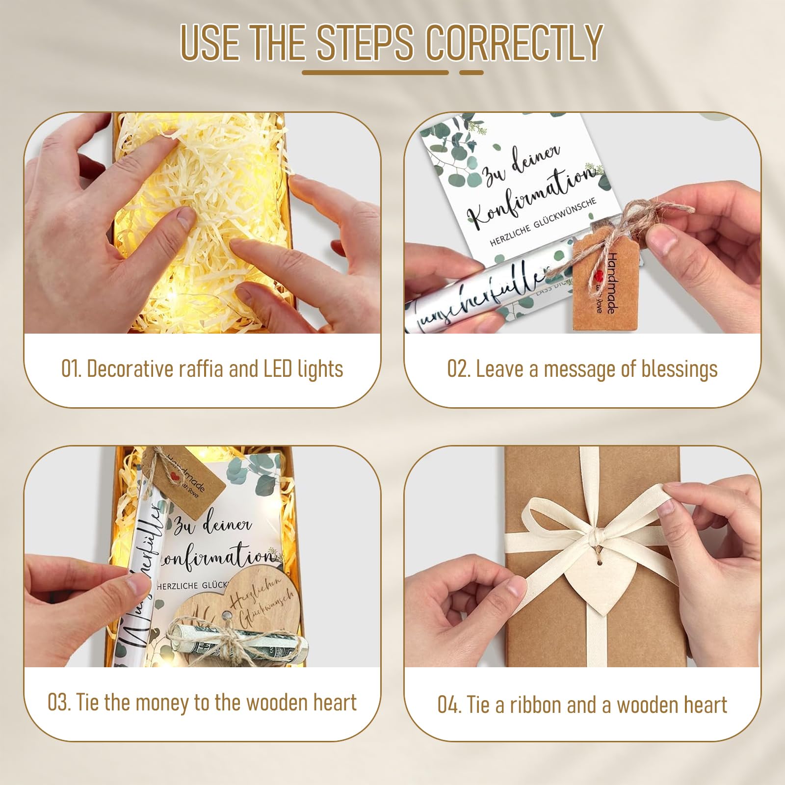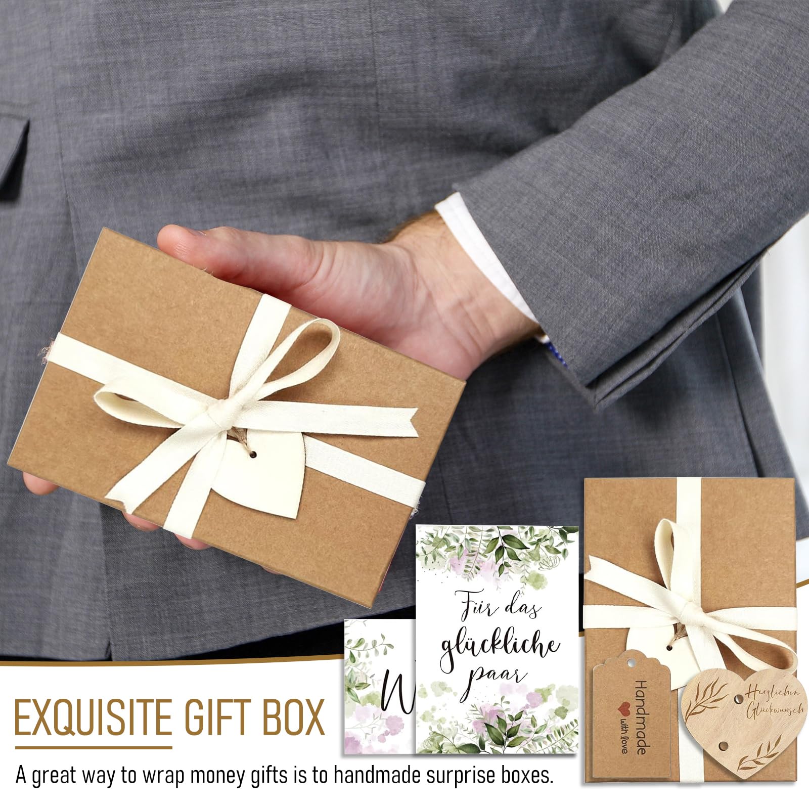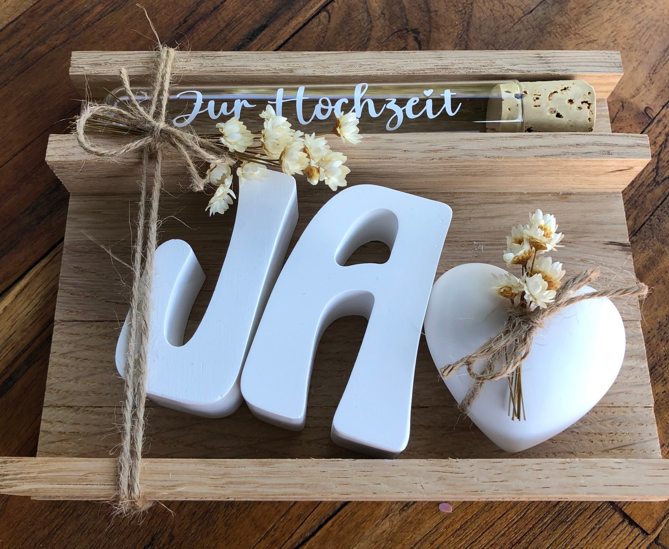 Das perfekte Geschenk fürs Brautpaar! Dieses wunderschöne Set macht aus einem einfachen Geldgeschenk etwas ganz Besonderes. Enthalten ist eine 16x16x2,5cm große Geschenkbox mit Lasercut-Muster, eine LED-Lichterkette mit 1,20m Länge, ein Reagenzglas mit Holzstopfen, Bast, Bindfaden und Kartenanhänger. Einfach das Geld im Reagenzglas verstauen, mit Bast dekorieren, die Lichterkette anbringen und schon habt ihr ein Geschenk das alle Blicke auf sich zieht! Die grüne Farbe wirkt frisch und modern. Perfekt für den Gabentisch und eine bleibende Erinnerung für das Brautpaar. Einfach aufbauen und begeistern!