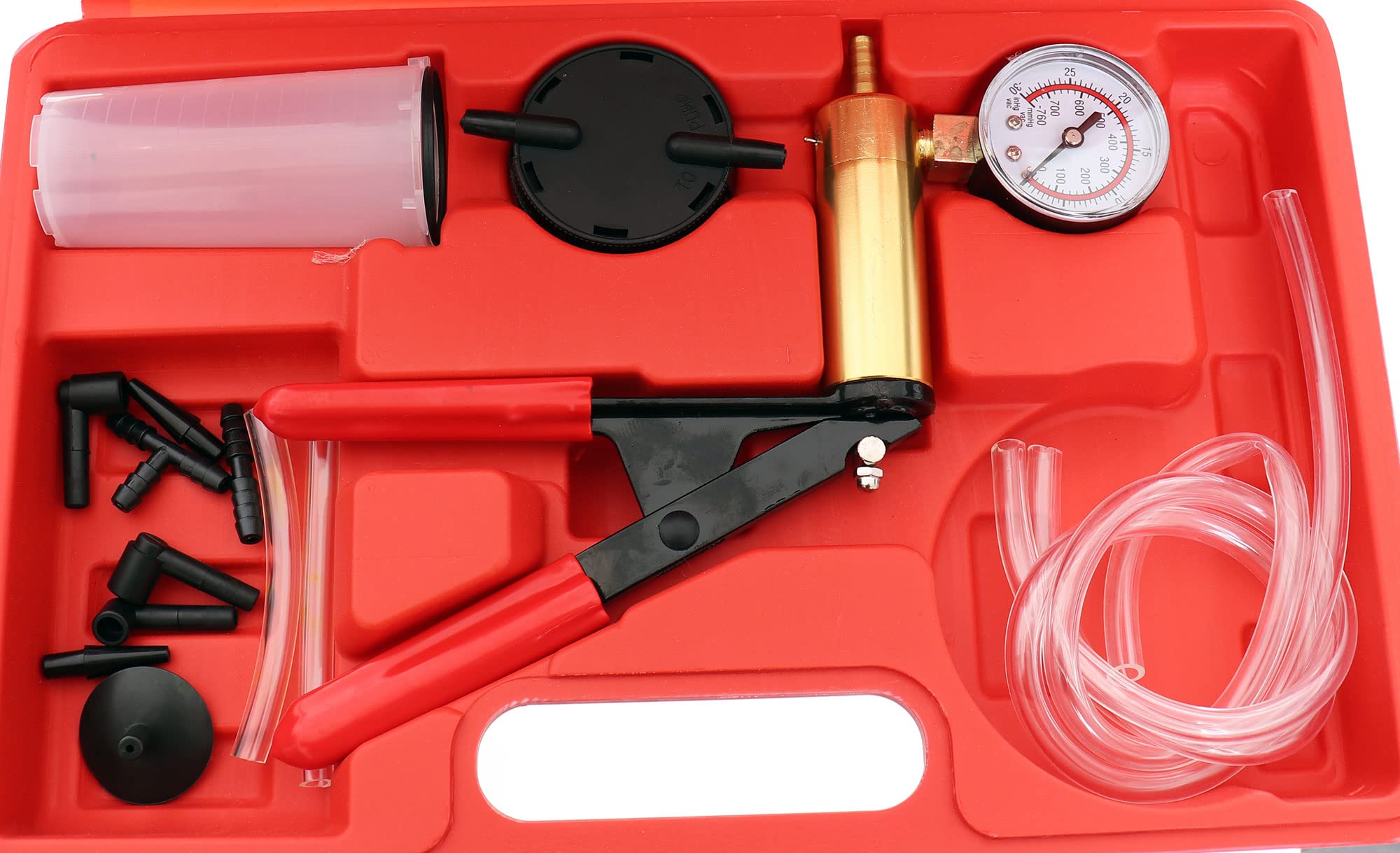 Für alle Hobby-Schrauber und Werkstatt-Fans: Dieses Vakuumpumpen-Set macht Bremsenentlüften zum Kinderspiel! Die handbetätigte Pumpe zieht die Flüssigkeit von selbst - kein Bremshebel oder Pedal mehr nötig. Mit präzisem Manometer (0-30 inHg) für alle Vakuumsysteme. Messingzylinder und austauschbare O-Ring Dichtungen sorgen für Langlebigkeit. Bis zu 635mmHg Unterdruck - damit kriegst du auch hartnäckige Systeme in den Griff. Alles sicher verpackt im blasgeformten Case - super organisiert und easy zu transportieren. Funktioniert bei allen Fahrzeugmarken!