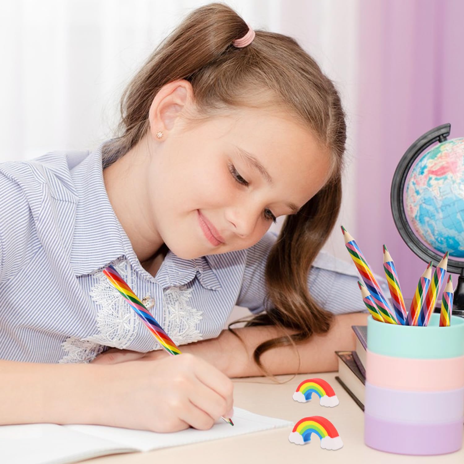 Wow, was für ein buntes Set! Diese 30-teilige Regenbogen-Kreativbox bringt Kinderaugen definitiv zum Leuchten. Enthalten sind 10 richtig schöne Regenbogenstifte in allen Farben des Regenbogens - die dreieckige Form ist perfekt für kleine Kinderhände und hilft beim Halten lernen. Dazu kommen 10 süße Radiergummis in Regenbogenform (jedes etwa 3,8 x 2,2 cm groß) - praktisch und niedlich zugleich! Und als Extra gibt's noch 10 bunte Hüpfbälle für Bewegungsspaß zwischendurch. Alles aus sicheren Materialien für Kinder ab 3 Jahren. Super für Kindergeburtstage, als Schulanfangs-Geschenk oder einfach so zum Malen und Spielen. Fördert die Kreativität und Feinmotorik - also lernen ohne dass die Kleinen es merken! Die stabile Aufbewahrungsbox hält alles ordentlich zusammen und ist praktisch für unterwegs. Auch für Kindergärten, Schulen oder als Belohnungssystem super geeignet. Macht sich übrigens auch super als Mitgebsel für die Geburtstagsfeier deines Kindes! Farben so kräftig wie auf dem Bild - da macht Malen gleich doppelt Spaß. Ein Geschenk, das garantiert ankommt und lange Freude bereitet!