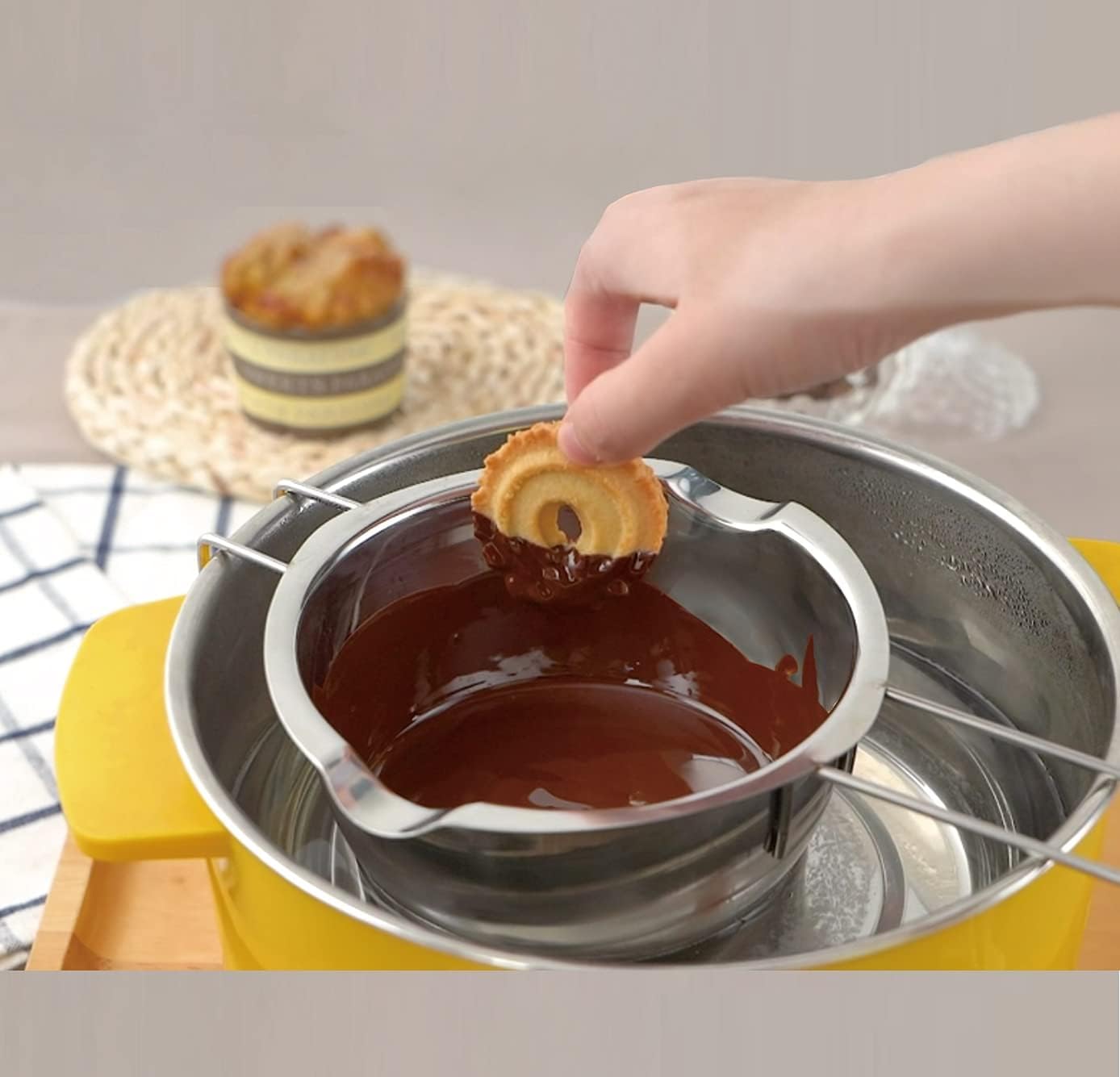 Für alle, die gerne schmelzen und rühren! Dieses Edelstahl-Set besteht aus zwei robusten Schmelztöpfen (25,5x14x6 cm), die sich perfekt fürs Wasserbad eignen. Schokolade schmilzt darin gleichmäßig ohne anzubern, Käse wird cremig, und Wachs für Kerzen lässt sich ideal verarbeiten. Das geniale Rillen-Design verhindert lästiges Überschwappen. Aus hochwertigem Edelstahl gefertigt, ist das Set rostfrei und super langlebig. Nicht nur zum Schmelzen geeignet - auch als warmer Saucenhalter oder zum Warmhalten von Speisen super praktisch. Perfekt für Hobbyköche, Chocolatiers und Bastelfreunde. Ein echter Allrounder in der Küche und Werkstatt!