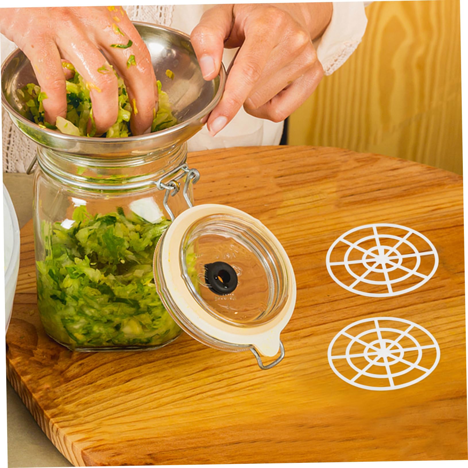 Total praktisch dieses 15-teilige Fermentier-Set von GLEAVI! Mit den weißen Pressnetzen aus Kunststoff wird Einmachen zum Kinderspiel. Einfach ins Einmachglas legen, das Netz übt gleichmäßigen Druck auf das Gemüse aus - perfekt für saure Gurken, Kimchi oder fermentierte Getränke. Mit 7,9x7,9x0,8cm passen sie super in verschiedene Glasgrößen. Super kompakt, platzsparend und leicht zu reinigen. Kein lästiges Beschweren mehr mit Steinen! Einfach Gemüse einlegen, Pressnetz drauf und den Gärprozess genießen. So einfach war Fermentieren noch nie - probier's aus!