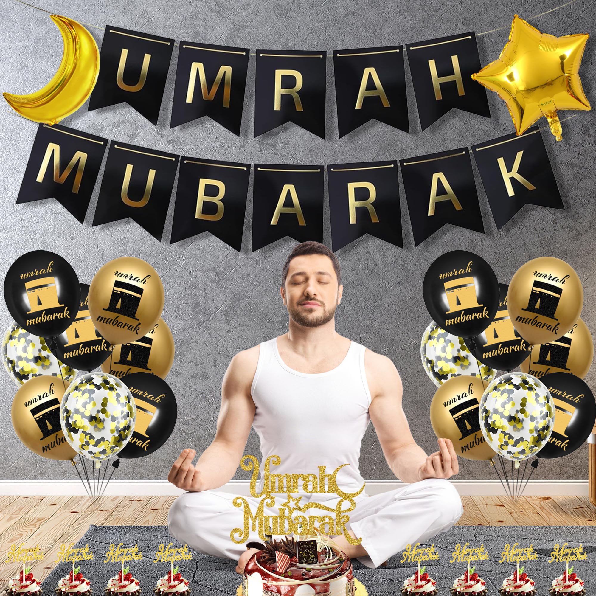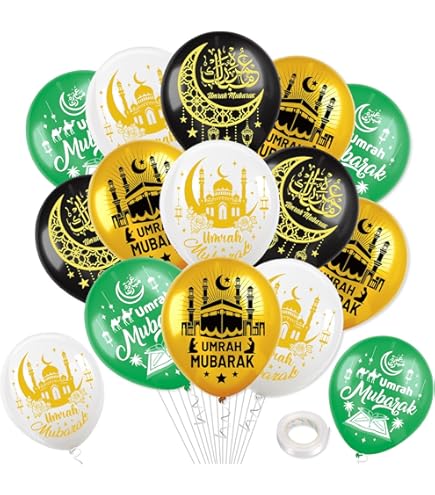 Feiere deine Umrah oder andere islamische Feste mit dieser wunderschönen Ballon-Dekoration in edlem Schwarz-Gold! Das Set enthält alles für eine festliche Atmosphäre. ✔️ Enthält: 1x 16\ Umrah Folienballon, 2x 22\ Umrah Ballons, 16x 12\ Latexballons, 6x hängende Dekorationen ✔️ Schwarz-Gold Farbkombination - elegant und traditionell ✔️ Mit islamischen Motiven und Segenssprüchen ✔️ Aus hochwertigem Latex und Aluminiumfolie ✔️ Einfach selbst zusammenzubauen Ob für Umrah, Hajj, Eid, Ramadan oder Moschee-Dekoration - dieses Set verwandelt jeden Raum in einen festlichen Ort. Die Ballons sind qualitativ hochwertig und halten die Luft lange. Mit dem beiliegenden Band und Kleber gestaltest du im Handumdrehen eine wunderschöne Dekoration. Perfekt um besondere religiöse Momente gebührend zu feiern und Gäste zu beeindrucken!