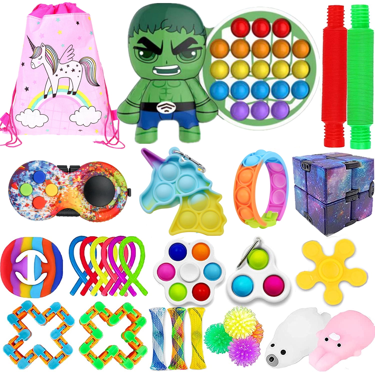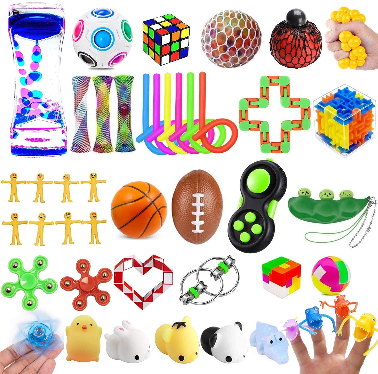 Dieses Fidget Toys Set ist einfach genial gegen Stress und Langeweile! 30 verschiedene Teile - da ist für jeden was dabei. Im Set findest du: Fingerspitzen-Blasen-Spinner, Regenbogen-Puzzleball, unendlichen Würfel, Block-Puzzleballs, Tintenfischbecher, Magic Animal Bracelets, Magnetringe, beliebte Rohre, Bungee-Kordeln, Zweirichtungs-Fingerspitzen-Kreisel, Gesichtsveränderung Oktopus, erweiterbare Telefongriffe, Fingerkuppen-Schlüsselringe, Tierknödel und Dekompressionsketten. Einfach drücken, drehen, dehnen oder spielen - so baust du Stress ab und beruhigst deine Nerven. Super für Kinder und Erwachsene mit ADHS, Autismus oder einfach nur zum Entspannen. Aus ungiftigen, nicht-allergenen Materialien - also absolut sicher. Trainiert auch die Sensibilität und fördert die Kreativität. Perfekt fürs Büro, die Schule oder einfach zu Hause. Macht einfach Spaß und hilft wirklich beim Abschalten. Einfach ausprobieren - du wirst überrascht sein wie entspannend das ist!