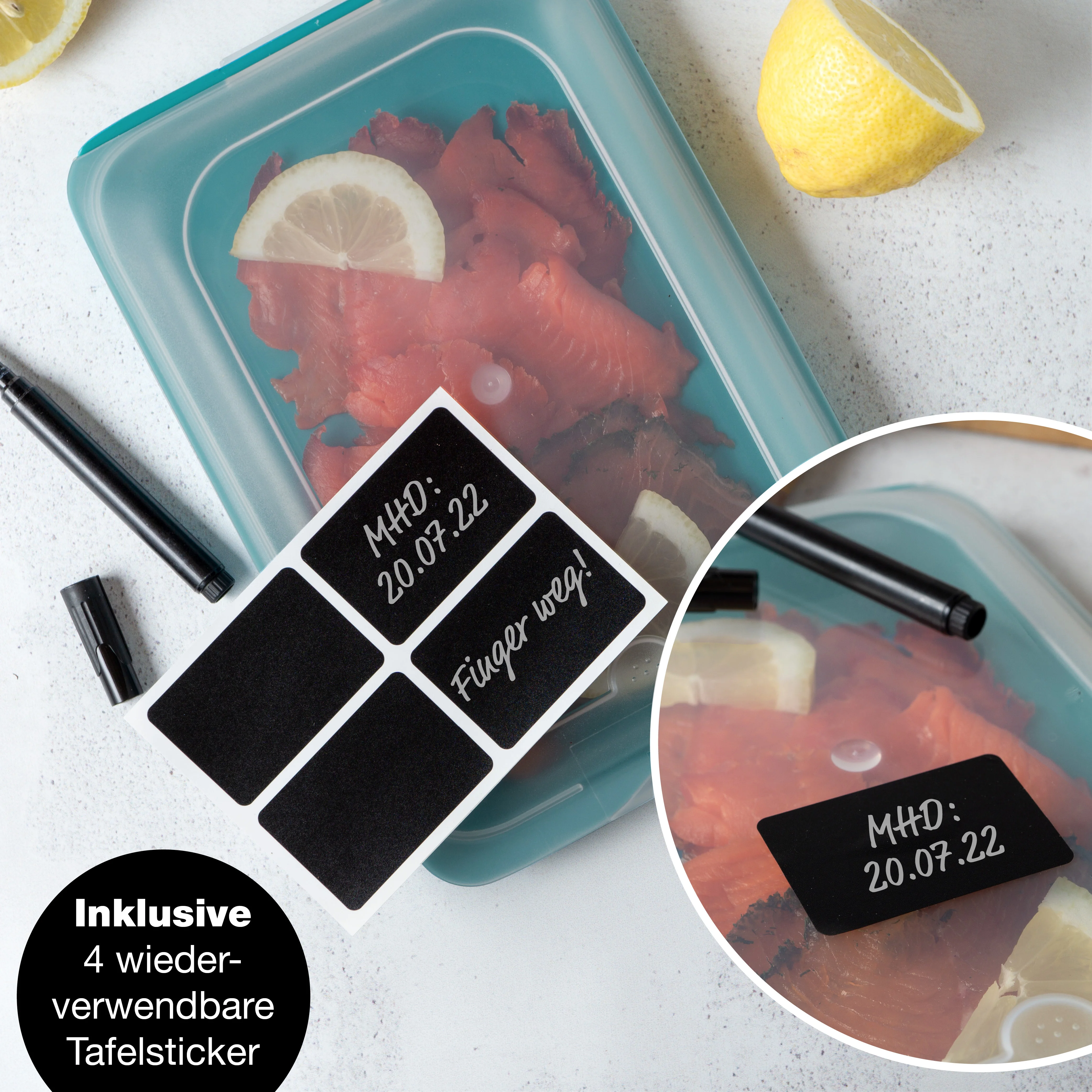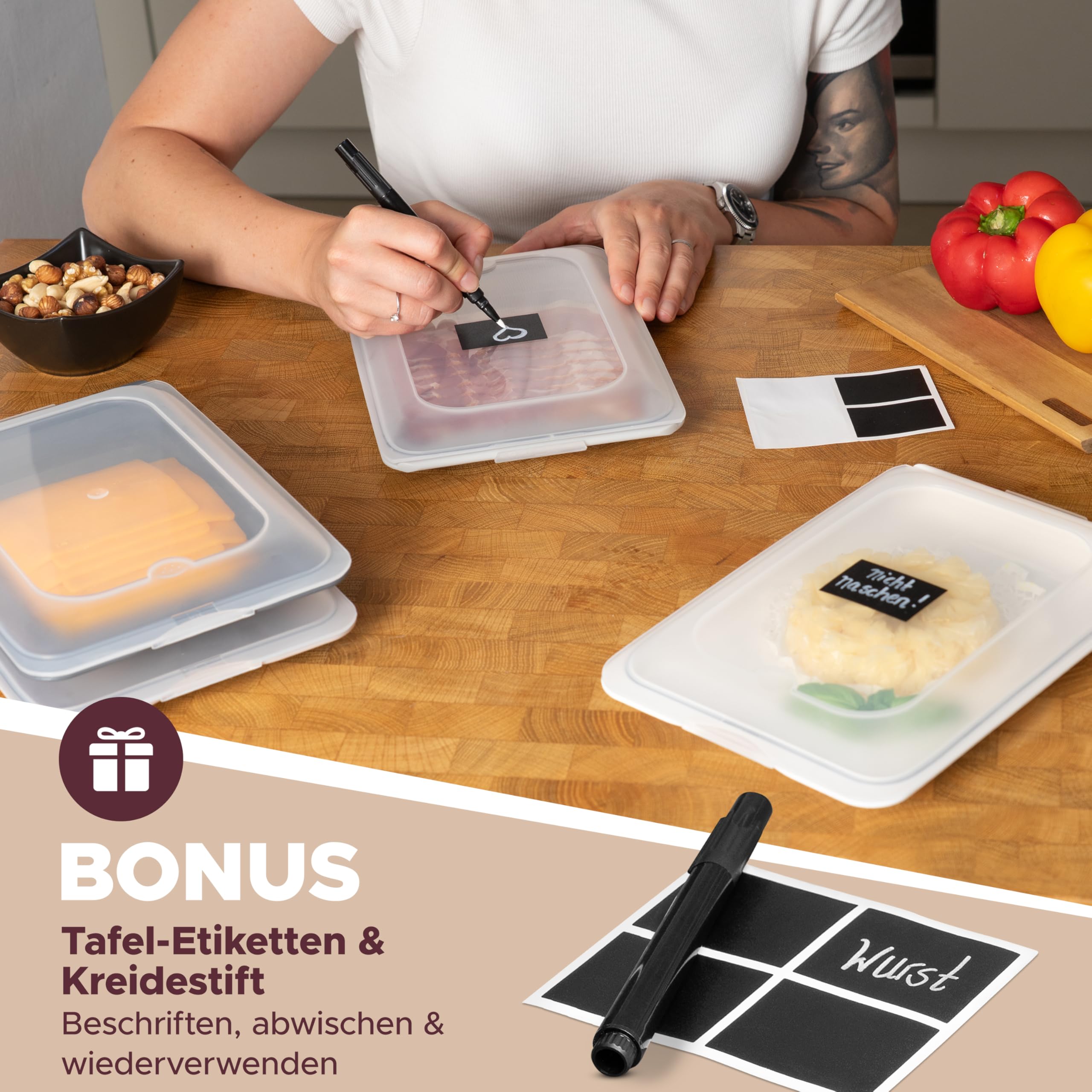 Endlich Ordnung im Kühlschrank! Mit diesen cleveren Aufschnittboxen von BUNDHEIM bleibt dein Wurst und Käse länger frisch. Der abnehmbare Silikonring und die extra breite Dichtung reduzieren den Luftaustausch um satte 70% - da schimmelt nichts so schnell! Die Boxen sind super praktisch stapelbar und rutschfest, sparen also jede Menge Platz. Die durchsichtigen Deckel zeigen dir sofort, was drin ist - kein lästiges Suchen mehr! Inklusive Kreidestift und Tafel-Etiketten: einfach beschriften und immer den Überblick behalten. Alles BPA-frei und lebensmittelecht, also völlig unbedenklich. Perfekt für Aufschnitt, Käse oder Reste vom Vortag. Und wenn's nicht passt: 12 Monate Geld-zurück-Garantie! Einfach ausprobieren - dein Kühlschrank wird's dir danken!