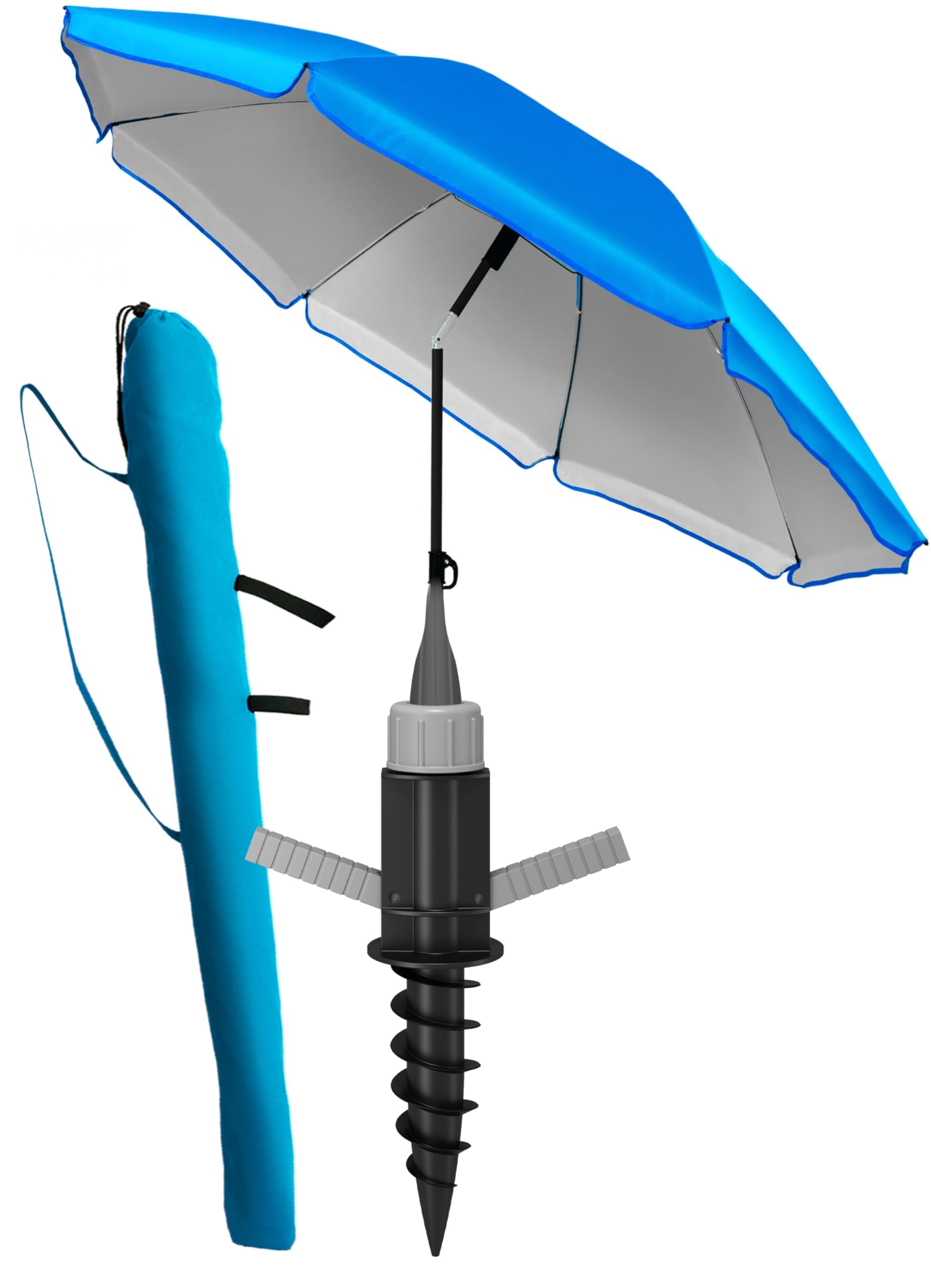 Endlich perfekter Sonnenschutz für Strand, Garten und Camping! Dieses 3-in-1 Set von 4smile enthält alles, was du brauchst: einen großen Strandschirm mit 200cm Durchmesser, eine stabile Bodenhülse und eine praktische Schutzhülle mit Tragegurt.