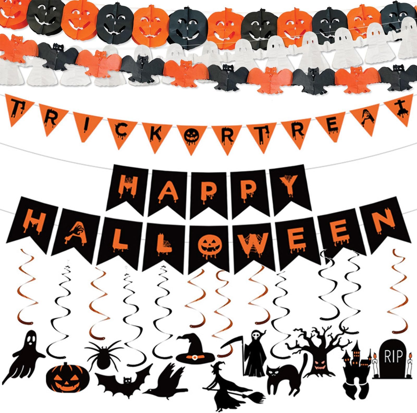 Boo! Mach deine Halloween-Party zur gruseligsten Feier des Jahres! Dieses komplette Dekorations-Set verwandelt dein Zuhause im Handumdrehen in eine schaurig-schöne Halloween-Location. Enthalten sind ein Happy Halloween-Banner, coole Wabenbälle, spiralförmige Streamer und punktierte Girlanden - alles, was du für die perfekte Grusel-Atmosphäre brauchst. Die knalligen Farben sorgen für echte Halloween-Stimmung und die Qualität ist so gut, dass du die Deko Jahre lang verwenden kannst. Die Montage ist super einfach, sodass du in wenigen Minuten partyready bist. Egal ob für die Kindergeburtstagsfeier, die Gruselparty mit Freunden oder einfach zur Dekoration für die kleinen Geister, die an Halloween an deine Tür klopfen - mit diesem Set liegst du immer richtig. Deine Gäste werden begeistert sein und die Fotos werden unvergesslich! Also worauf wartest du noch? Hol dir den Halloween-Spirit ins Haus!