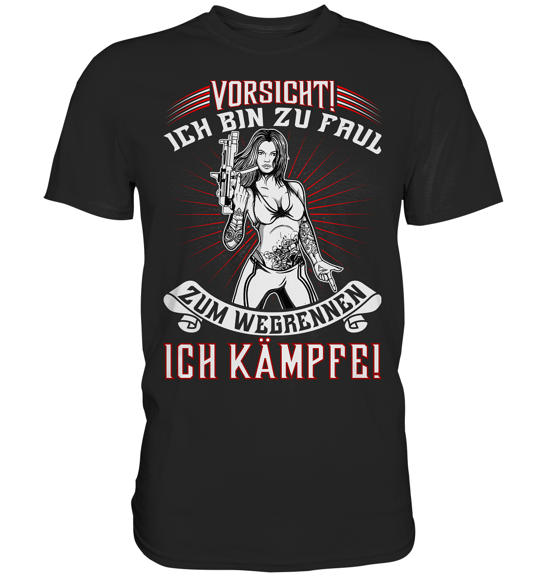 Dieses T-Shirt bringt garantiert Lacher! Mit dem witzigen Spruch 'Vorsicht Bin zu dick zum wegrennen ICH KÄMPFE' ziehst du alle Blicke auf dich. Aus 100% Baumwolle mit 190g/qm - angenehm dick und langlebig. Im körperbetonten Regular Fit geschnitten - wenn du es lieber locker magst, einfach eine Größe größer bestellen. Der Rundhalsausschnitt und die kurzen Ärmel sorgen für sportlichen Komfort. Perfekt für Sommer und Winter gleichermaßen. Maschinenwaschbar bei 40°C, von links bügeln. Hergestellt aus veganer, nachhaltiger Bio-Baumwolle mit Oeko-Tex Standard 100 Zertifikat. Ein ideales Geschenk für alle mit Humor oder einfach für dich selbst!