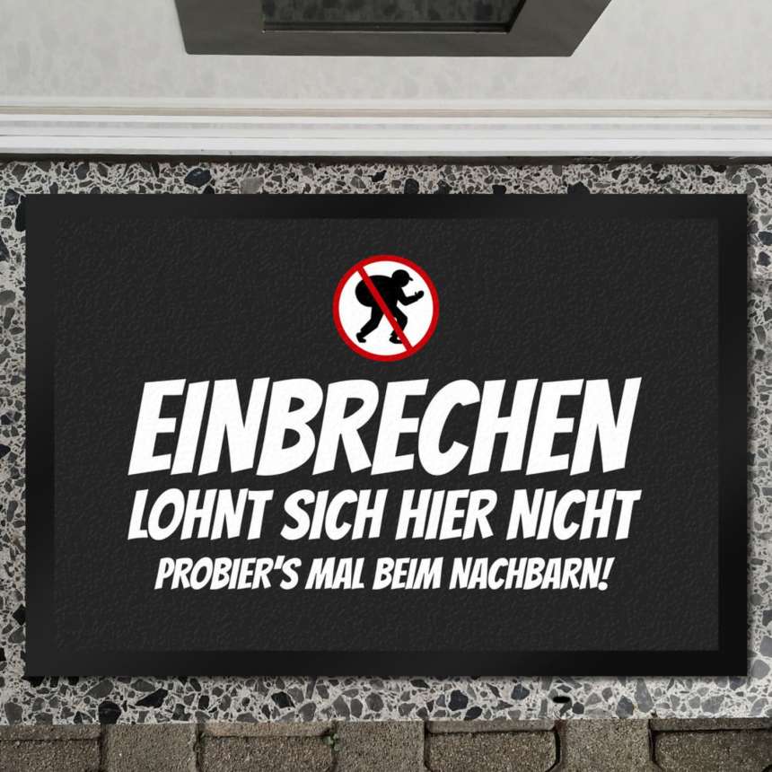 Sicherheitsbewusste Hausbesitzer - diese lustige Fußmatte ist genau das Richtige für eure Haustür! Mit dem Spruch 'Einbrechen lohnt sich hier nicht! Probieren Sie es beim Nachbarn aus.' schreckt sie jeden potentiellen Einbrecher ab. Aus 100% Polyamid gefertigt, mit rutschfester PVC-Unterseite - liegt sicher und verrutscht nicht. Maße 40x60cm passen perfekt vor jede Tür. Nicht nur praktisch, sondern auch ein echter Blickfang und Gesprächsstarter für Gäste. Die humorvolle Botschaft ist trotzdem effektiv - wer will schon bei jemandem einbrechen, der so offen mit dem Thema umgeht? Einfach vor die Tür legen und sich etwas sicherer fühlen. Perfekt für alle, die ihr Zuhause schützen wollen ohne gleich teure Alarmanlagen zu installieren. Macht deine Haustür zu nem echten Hingucker!