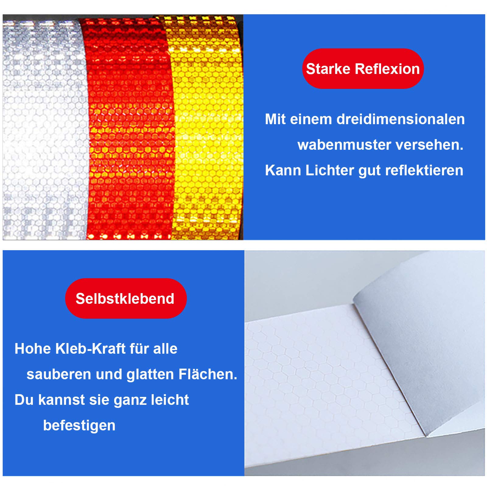 Unsichtbar bei Dunkelheit? Dieses Reflektorband macht dich sichtbar! Selbstklebend und super einfach anzubringen - einfach zuschneiden, Folie abziehen und auf jede saubere Oberfläche kleben. Wasserdicht und witterungsbeständig, hält auch bei Regen und Wind. Perfekt für Fahrräder, Helme, Taschen, Autos - eigentlich alles was bei Nacht sichtbar sein soll. Die starke Reflexion wird dich von Weitem sichtbar machen und Unfälle vermeiden. Ob beim Joggen, Radfahren oder Spazieren - Sicherheit geht vor! Kein Werkzeug nötig, einfach und schnell angebracht. Mach dich sichtbar und fühl dich sicher bei nächtlichen Aktivitäten!