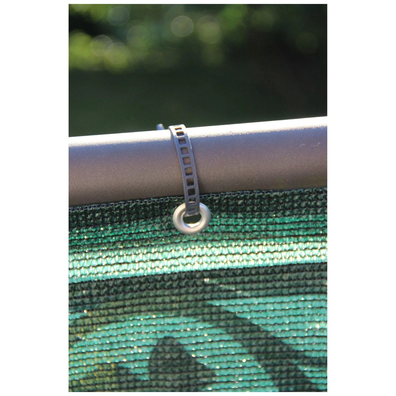 Aus flexiblem und reißfestem Polyethylen, das witterungsbeständig und UV-stabil ist. Die umlaufenden Metallösen machen die Montage am Balkongitter super einfach - einfach durchfädeln und fertig!