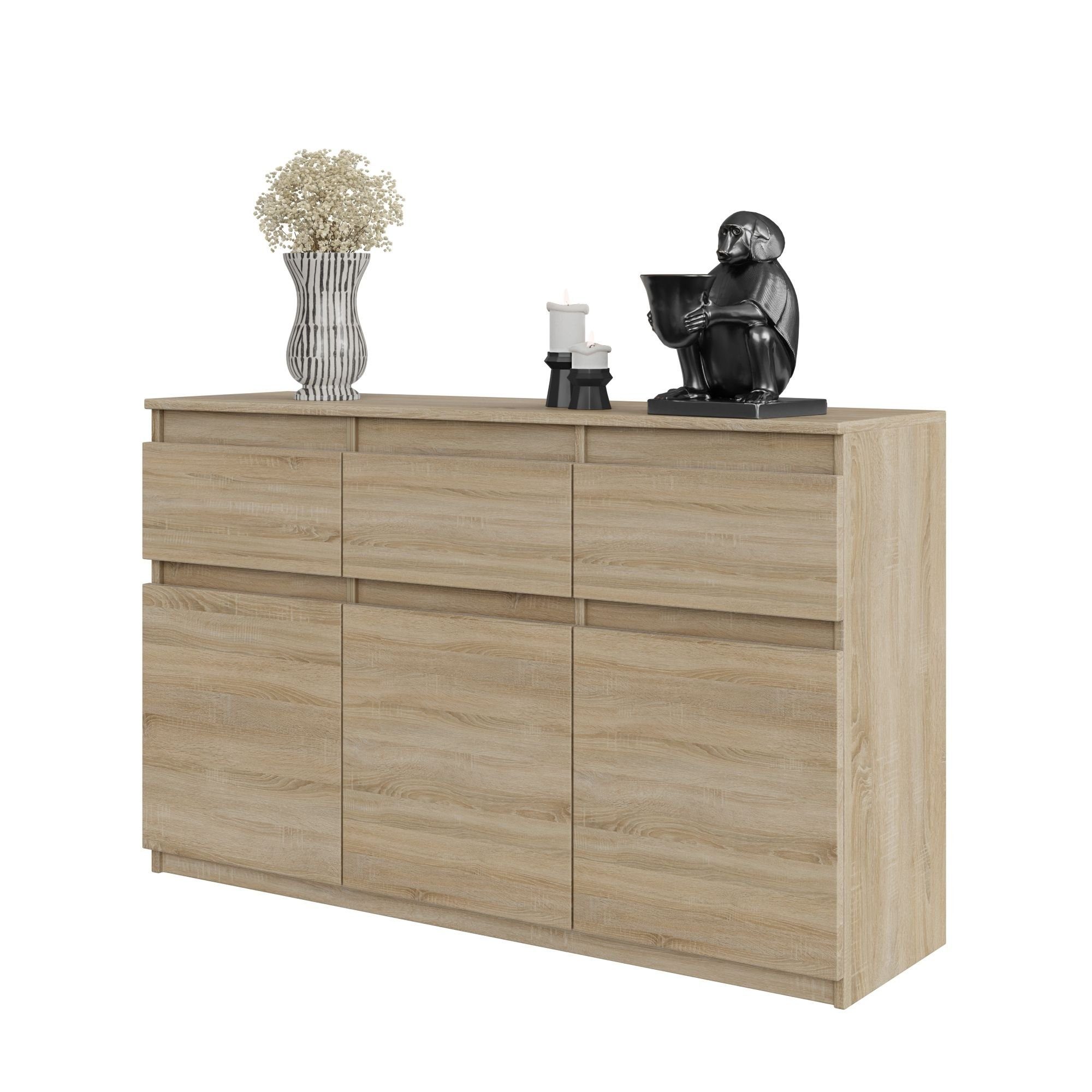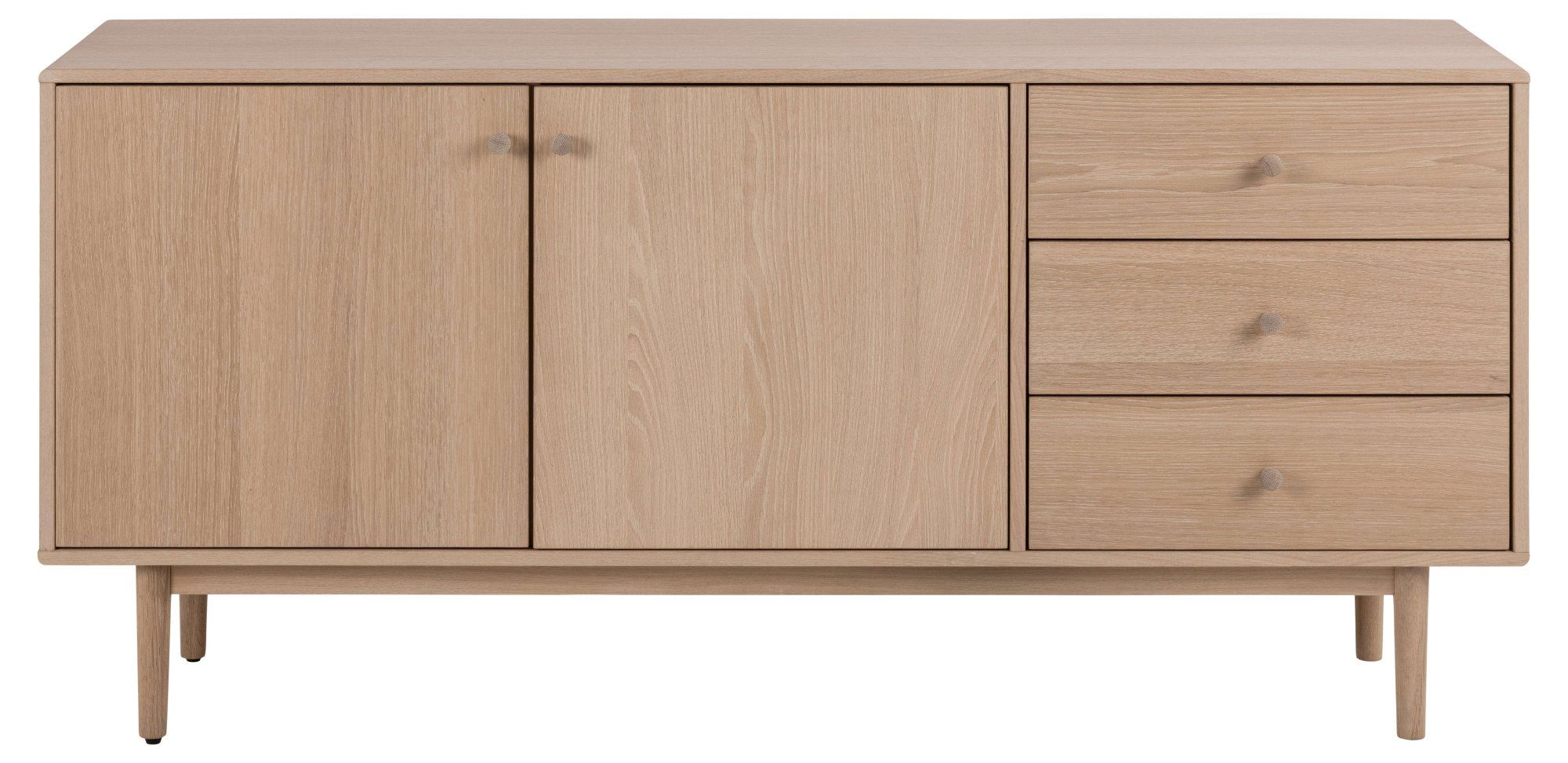 Diese HOMN LIVING Anrichte 'Bella' bringt richtig Stil in dein Wohnzimmer! Mit 120 cm Breite, 38 cm Tiefe und 76 cm Höhe findet das Sideboard auch in kleineren Räumen Platz. Die Kombination aus Eiche-Optik und natürlichen Rattan-Fronten ist total im Trend - rustikal und modern zugleich. 2 Türen und 3 Schubladen bieten jede Menge Stauraum für Geschirr, Bücher, Deko oder was auch immer du verstauen willst. Die Metallschienen sorgen für ein sanftes Öffnen der Schubladen, und die schwarzen Metallgriffe runden das Design perfekt ab. Aus hochwertigem Melamin gefertigt ist das Möbelstück super langlebig und pflegeleicht. Die Montage ist einfach - das Sideboard kommt mit verständlicher Anleitung und allem nötigen Zubehör. Die 12 cm hohen Beine geben dem Möbelstück eine elegante Leichtigkeit. Ob neben dem Esstisch, als TV-Möbel oder einfach als dekoratives Element - diese Anrichte macht überall was her. Einfach aufbauen und sich an dem neuen Möbelstück erfreuen!