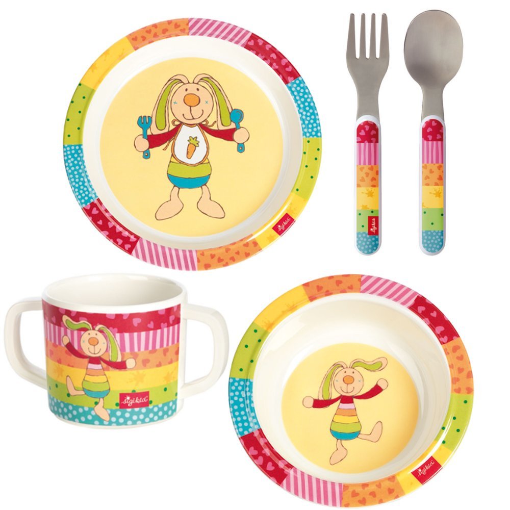So macht Essen lernen richtig Spaß! Dieses niedliche sigikid Geschirr-Set mit süßen Hunde- und Katzen-Motiven ist perfekt für Kinder von 3 bis 8 Jahren. Im Set findest du alles, was dein Kind braucht: einen Teller mit cleverem abgeschrägten Rand (damit nichts mehr vom Teller rutscht), eine praktische Schüssel, eine Tasse mit zwei Griffen für sicheren Halt und kindgerechtes Besteck. Die Gummiringe an der Unterseite sorgen dafür, dass nichts verrutscht - super praktisch für kleine Hände! Aus 100% BPA-freiem Melamin und nach LFGB geprüft, ist es absolut lebensmittelecht und unbedenklich. Spülmaschinengeeignet ist es auch - aber Achtung: Nicht für die Mikrowelle geeignet! Warmes Essen bitte erst abkühlen lassen. In der hübschen Geschenkbox verpackt ist es das ideale Geschenk zum Geburtstag oder einfach so. Mit diesem fröhlichen Geschirr wird jede Mahlzeit zum Abenteuer und dein Kind lernt mit Freude, selbstständig zu essen. Robust, sicher und einfach niedlich - genau das richtige für kleine Feinschmecker!