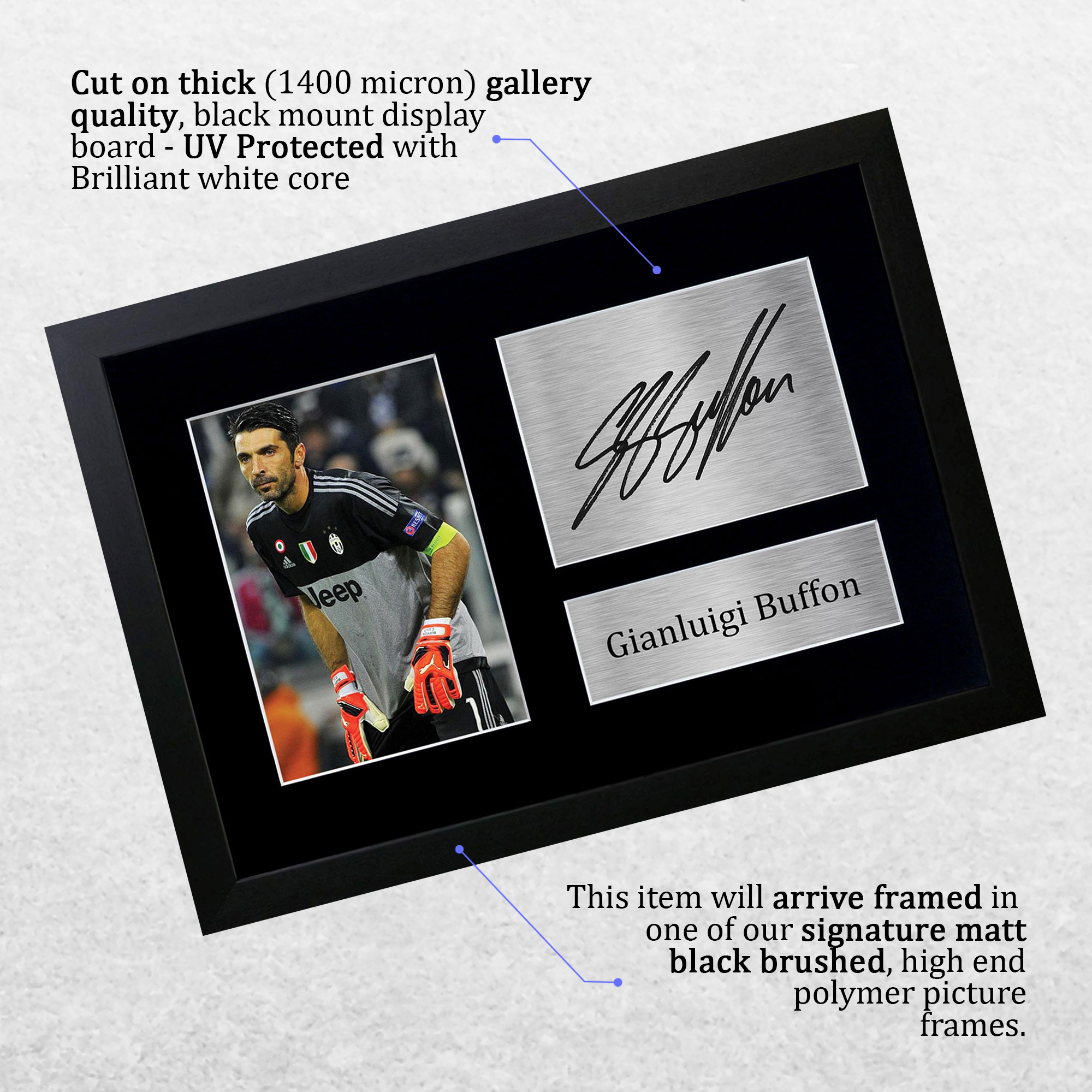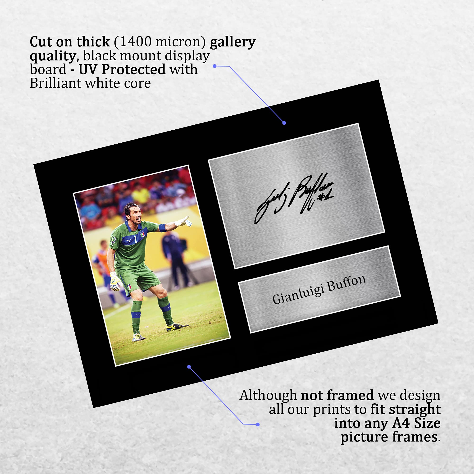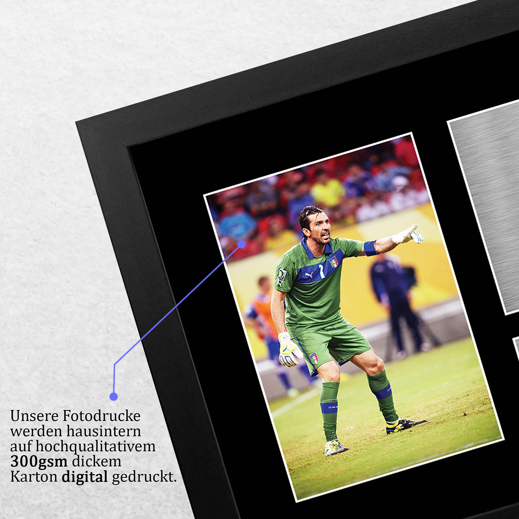 Das perfekte Geschenk für jeden Buffon-Fan! Dieses coole A4 Display (297x210mm) zeigt den legendären Torwart Gianluigi Buffon in Action - mit gedrucktem Autogramm und Namenszug im metallischen Look. Professionell im Studio gefertigt, auf säurefreiem schwarzem Karton montiert. Super einfach zu präsentieren: Entweder direkt aufhängen oder in einen Standard-A4-Rahmen stecken. Sieht aus wie ein echtes Autogramm, aber ohne den hohen Sammler-Preis! Perfekt fürs Jugendzimmer, Büro oder die Fan-Sammlung. Leicht aber hochwertig verarbeitet - ein echter Hingucker für jeden Fußball-Begeisterten. Ob zu Weihnachten, zum Geburtstag oder einfach so - mit diesem Geschenk machst du garantiert eine gute Figur! Die Qualität überzeugt und der Preis ist unschlagbar. Für junge und erwachsene Fans gleichermaßen geeignet. Hol dir ein Stück Fußball-Geschichte ins Haus!