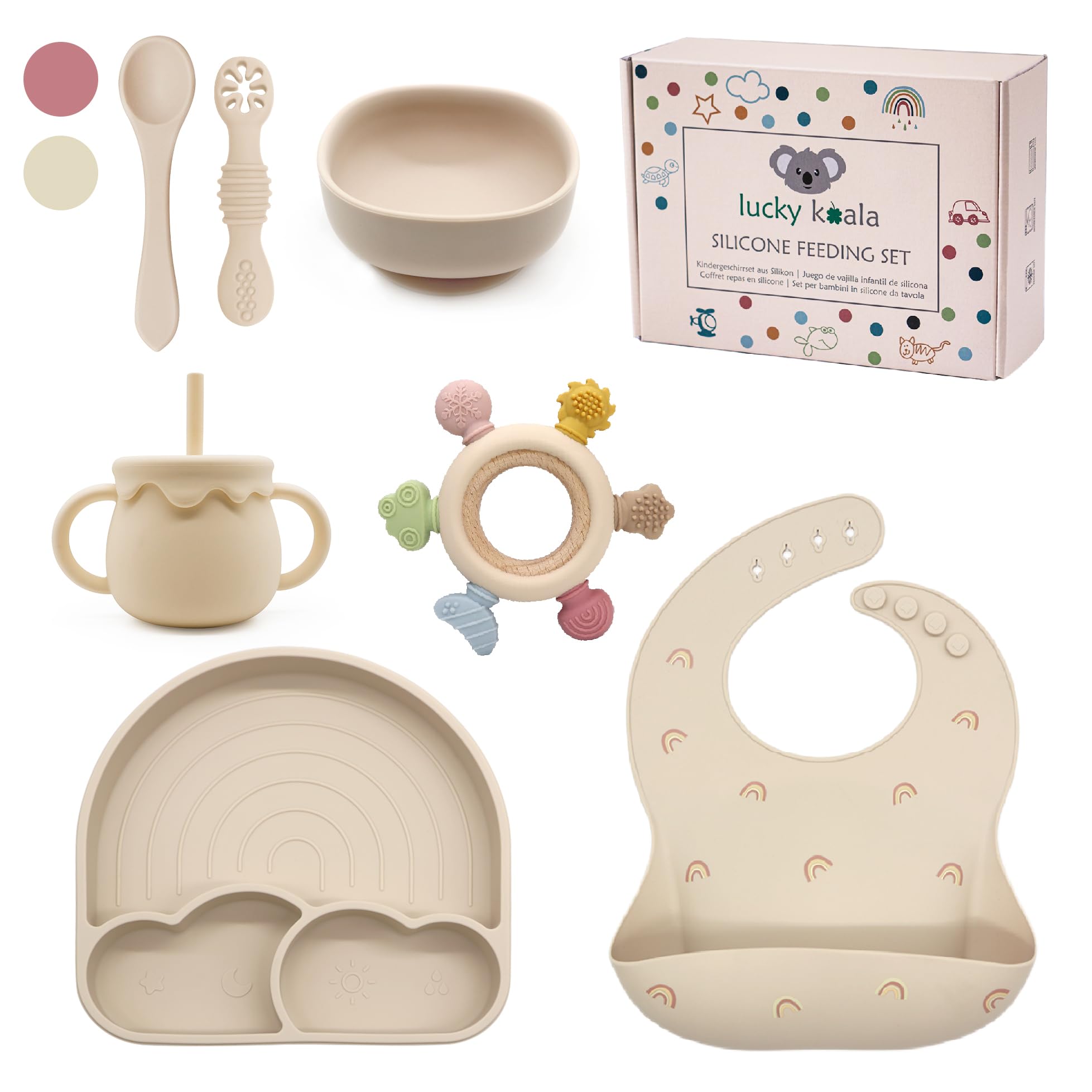Wie süß ist denn dieses Silikon-Babygeschirr! 6-teiliges Set mit Teller, Schüssel, Tasse, Lätzchen, Löffel und Gabel - alles aus 100% lebensmittelechtem Silikon, BPA-frei!