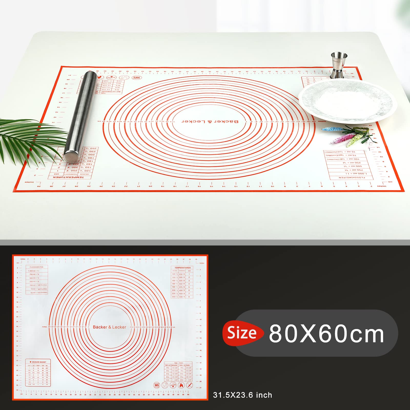 Backen war noch nie so einfach! Diese praktische Silikon-Teigmatte mit Glasfaser-Verstärkung ist deine neue beste Freundin in der Küche. Mit 70x50cm bietet sie reichlich Platz für Teig, Pizza oder Plätzchen. Die Antihaft-Oberfläche sorgt dafür, dass nichts kleben bleibt - kein zusätzliches Mehl mehr nötig! Die rutschfeste Rückseite hört sicher auf der Arbeitsplatte. Mit praktischen Maßmarkierungen und Umrechnungstabellen für perfekte Backergebnisse. Hitzebeständig, BPA-frei und lebensmittelecht. Nach Gebrauch einfach in die Spülmaschine (oberer Korb) oder schnell von Hand abwaschen. Zusammenrollbar für platzsparende Aufbewahrung. Ein tolles Geschenk für alle Backbegeisterten - ob für Anfänger oder Profis!