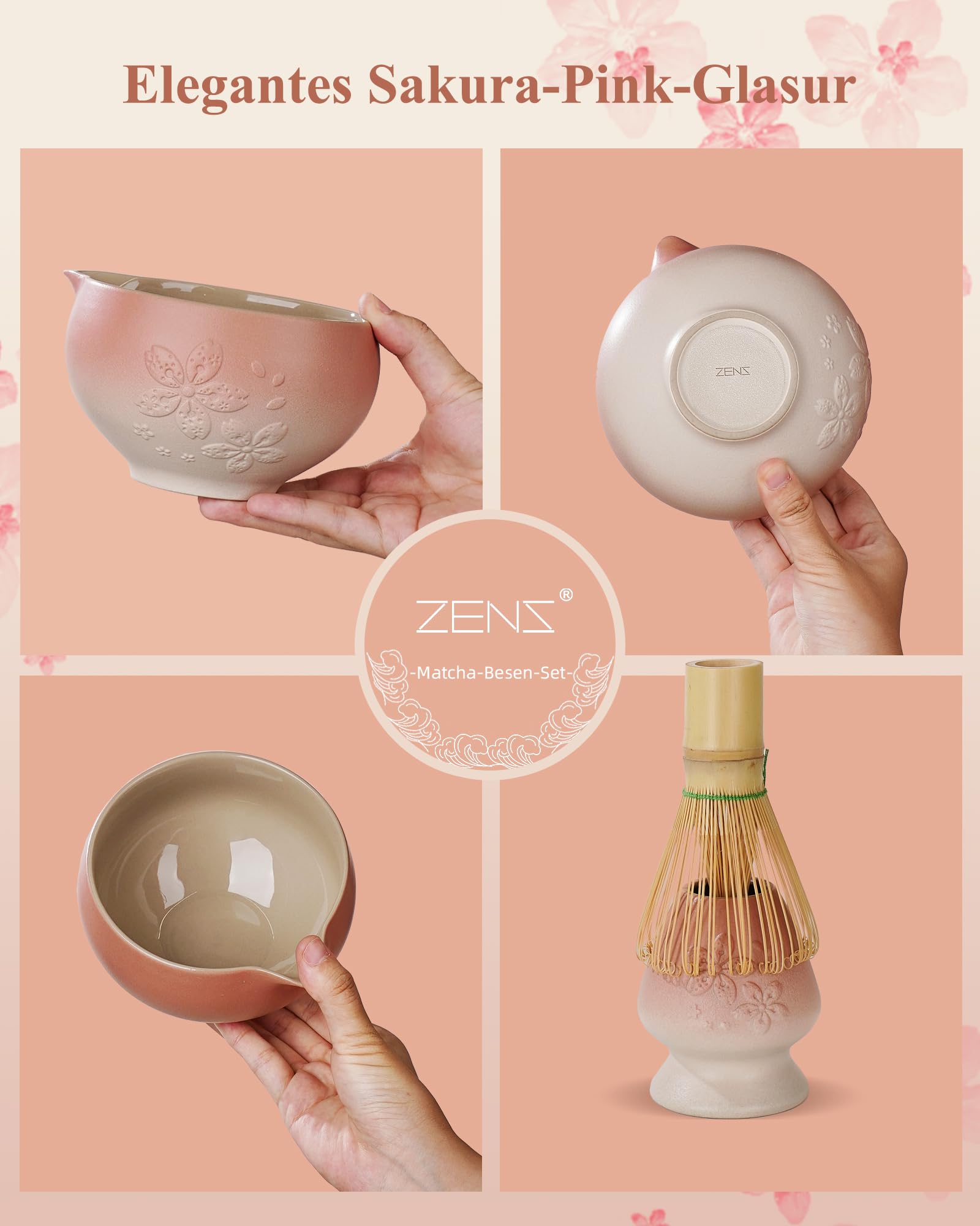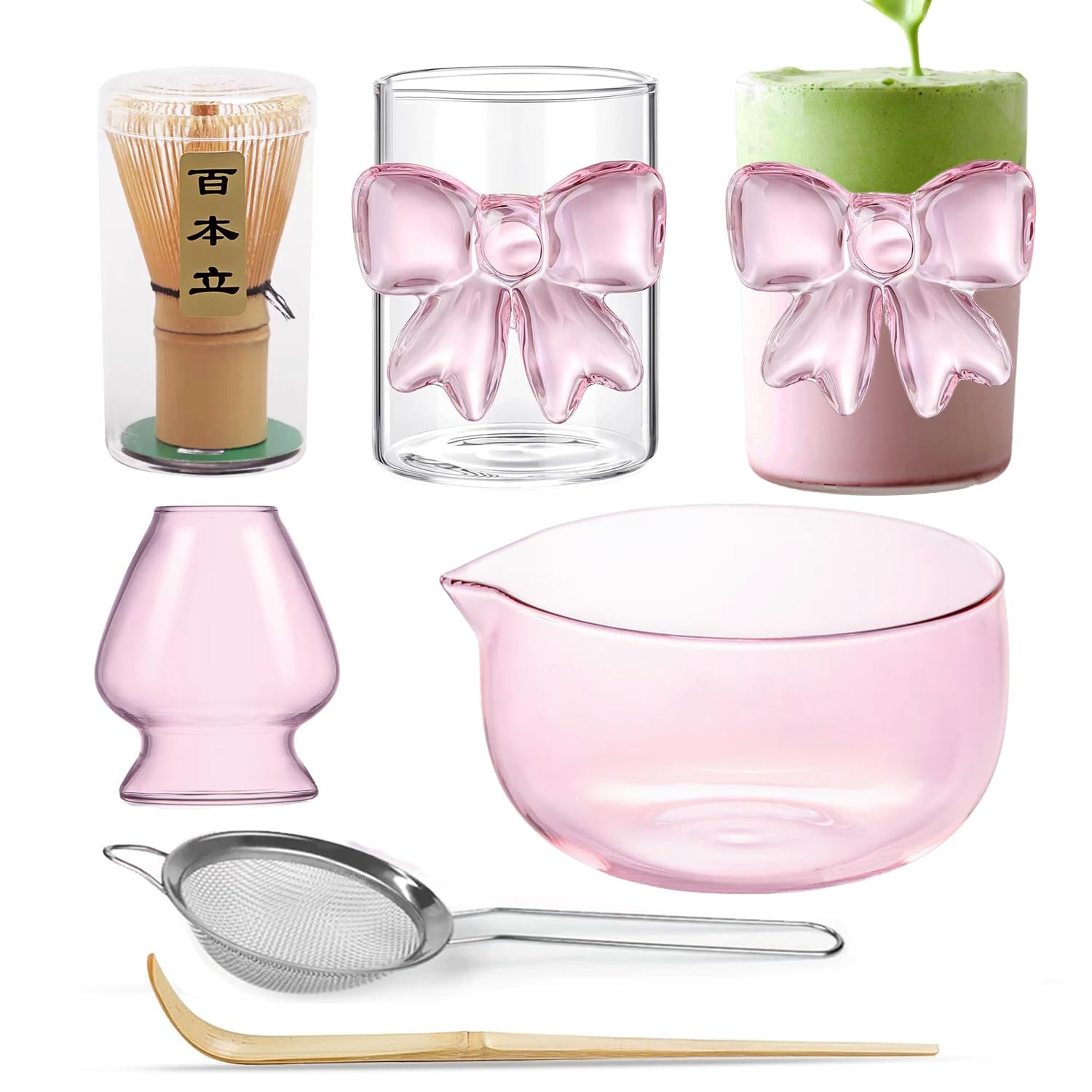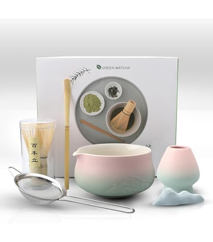 Matcha-Liebhaber aufgepasst! Dieses wunderschöne rosa Matcha-Set hat alles, was du für die perfekte Tasse Matcha brauchst. Im 8-teiligen Set findest du: Matcha-Schale mit praktischem Ausgießer, Bambus-Besen (Chasen), Besenhalter, Bambus-Löffel mit Ablage und ein feines Sieb. Alles in zartem Rosa gehalten - einfach hinreißend! Die Schale ist aus traditioneller Keramik mit zweifarbiger Glasur, der Besen aus 100% Bambus. Perfekt für die Zubereitung von Matcha Latte, traditionellem Matcha-Tee oder anderen Matcha-Getränken. Nicht nur praktisch, sondern auch ein echter Hingucker in deiner Küche. Toll als Geschenk für Tee-Fans oder einfach für dich selbst, wenn du Wert auf Qualität und Ästhetik legst. Die orientalische Note verleiht dem Ganzen eine besondere Eleganz. Ob morgens für den Energie-Kick oder nachmittags zur Entspannung - mit diesem Set wird jede Tasse Matcha zum Erlebnis. Einfach schön, einfach praktisch, einfach perfekt!