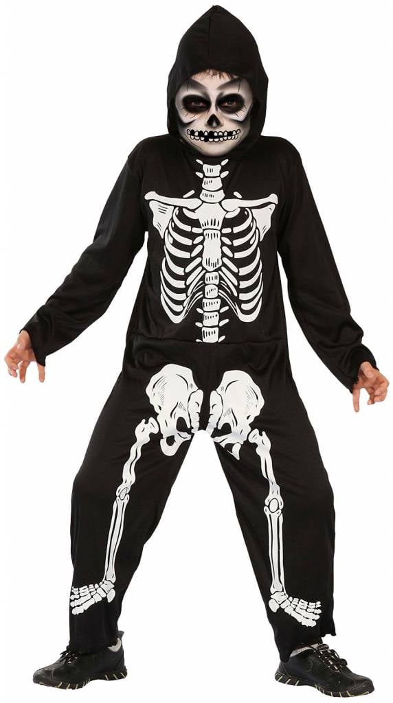 Gruselig cool! Dieses Skelett-Kostüm für Kinder leuchtet im Dunkeln - der absolute Hit für Halloween! Komplett-Set mit Kapuze, Overall und Handschuhen, alles mit Knochen-Muster. Aus weichem, dehnbarem Polyester, der atmungsaktiv ist und schnell trocknet. Einfach an- und ausziehen dank Klettverschluss auf dem Rücken. Vor dem Tragen mit starkem Licht 'aufladen' - dann leuchtet es umso besser. Für Jungen und Mädchen von 3-13 Jahren geeignet - bitte Größe vorher checken. Perfekt für 'Süßes oder Saures', Halloween-Partys oder wenn dein Kind einfach mal ein gruseliges Abenteuer erleben will. Damit wird dein Kind zum Star jeder Halloween-Party!