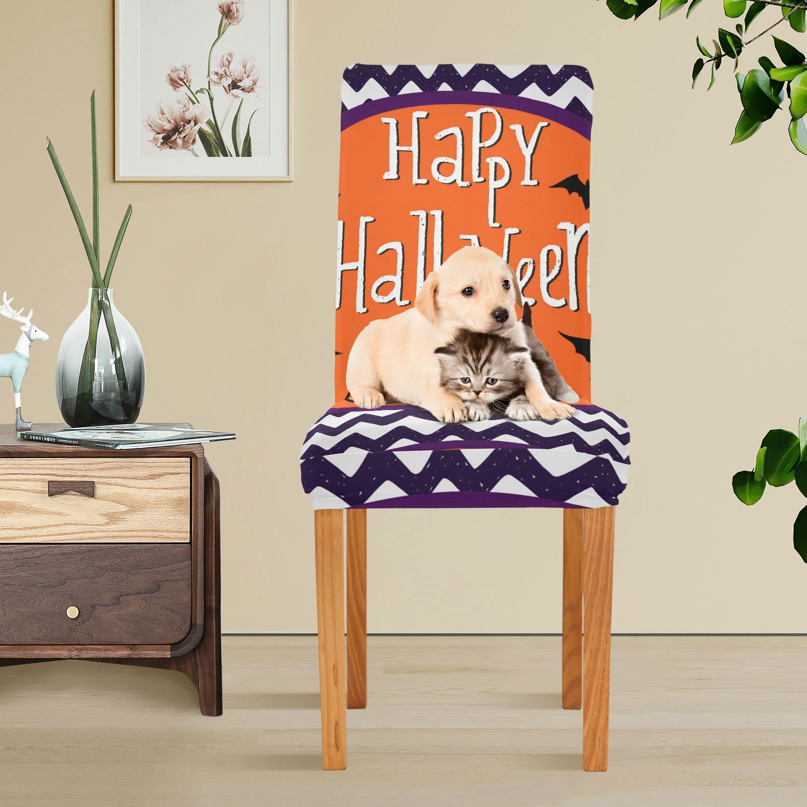 Verwandle deine Stühle in gruselige Halloween-Deko! Diese coolen Stuhlhussen mit tanzenden Skeletten und Herbstblättern machen jede Party zum Highlight. Aus dehnbarem Spandex gefertigt, passen sie auf fast alle Stuhlformen und -größen. Super praktisch: Sie sind waschbar und schützen deine Stühle vor Flecken und Verschüttungen. Einfach über den Stuhl ziehen - schon ist die Halloween-Deko fertig! Nach der Party schnell in die Waschmaschine und fürs nächste Jahr verstauen. Perfekt für Esszimmerstühle, Bürostühle oder Gartenmöbel. Mach deine Halloween-Party unvergesslich!