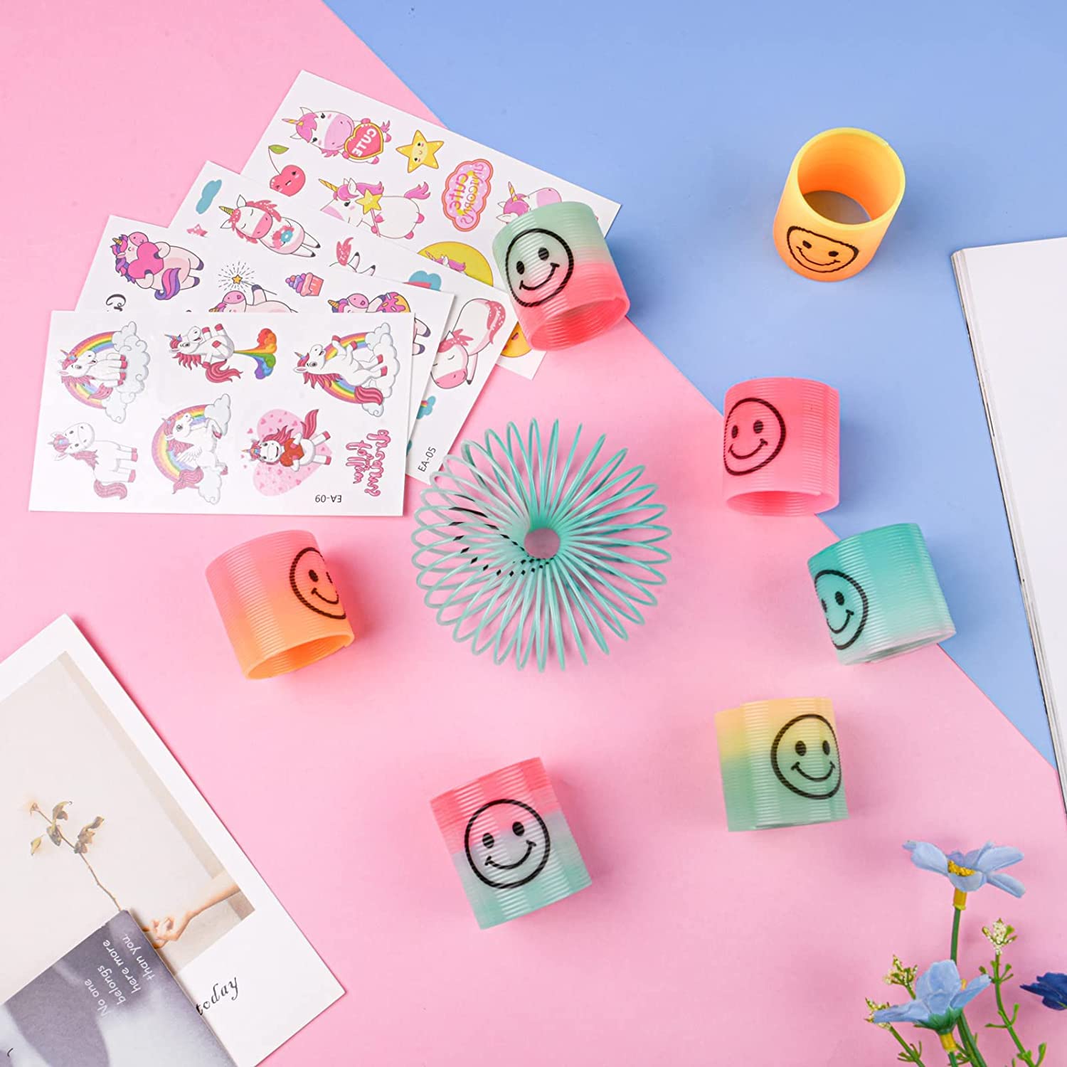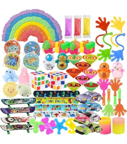 Perfekte Füllung für Kinder-Partybeutel! Dieses Set enthält 72 coole Kleinigkeiten: 10 Slap-Armbänder, 12 Regenbogenspiralen, 10 Mochi-Squishy-Spielzeuge, 10 Springbälle, 10 temporäre Tattoos und 10 Schlüsselanhänger. Alles aus hochwertigen Materialien - glatte Kanten ohne Grat, kindersicher nach EN71 Norm. Ideal für Geburtstagspartys, Schulpreise, Pinatas oder Adventskalender. Verschiedene bunte Designs - für Jungen und Mädchen gleichermaßen begeisternd. Einfach auf die Gäste verteilen - jeder bekommt gleich viel. Spart Zeit und Geld - keine mühsame Einzelfüllung mehr. Mach die nächste Kinderparty zum Erfolg - mit dieser praktischen Geschenkesammlung!
