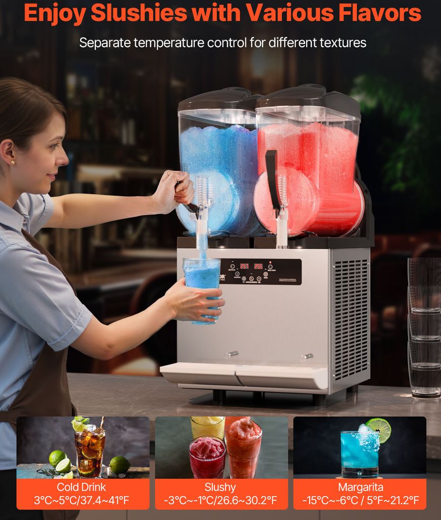 Perfekt für Partys, Events oder deinen eigenen kleinen Stand! Diese professionelle Slush Maschine mit zwei 3-Liter-Tanks produziert bis zu 24 Tassen leckeres Slush-Eis pro Charge. Mit 370W Leistung und einem hochwertigen Kupfer-Kompressor kühlt sie blitzschnell - in nur 45-80 Minuten hast du perfektes Eis. 15 einstellbare Temperaturstufen von -11°C bis 5°C geben dir die volle Kontrolle über die Konsistenz. Egal ob Fruchtsäfte, Margaritas oder Eiskaffee - hier wird alles zum erfrischenden Genuss. Die automatische Selbstreinigung macht die Pflege super einfach, und die Kindersicherung sorgt für zusätzliche Sicherheit. Aus robustem Edelstahl und lebensmittelechtem PC-Material gefertigt, hält diese Maschine auch im gewerblichen Einsatz problemlos mit. Maße: 35x52x50cm, perfekt für Bars, Cafés oder den privaten Gebrauch. Einfache Bedienung über das digitale Display - so macht Slush-Eis machen richtig Spaß!